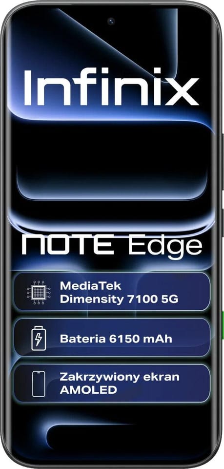 Infinix NOTE Edge to smartfon, który łączy w sobie zaawansowaną wydajność z nienagannym, ultracienkim designem o grubości zaledwie 7,2 mm, jednocześnie kryjąc w smukłej obudowie olbrzymią baterię 6150 mAh. Zakrzywiona krawędź i bezramkowy ekran nadają urządzeniu nowoczesny, spójny charakter, doskonale leżąc w dłoni i łącząc elegancki wygląd z codzienną ergonomią. Wysoka odporność na uszkodzenia została osiągnięta dzięki klasie IP65, która chroni przed wodą i kurzem, oraz wzmocnionemu szkłu Corning Gorilla Glass 7i, skutecznie zabezpieczającemu ekran przed skutkami przypadkowych upadków.