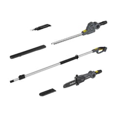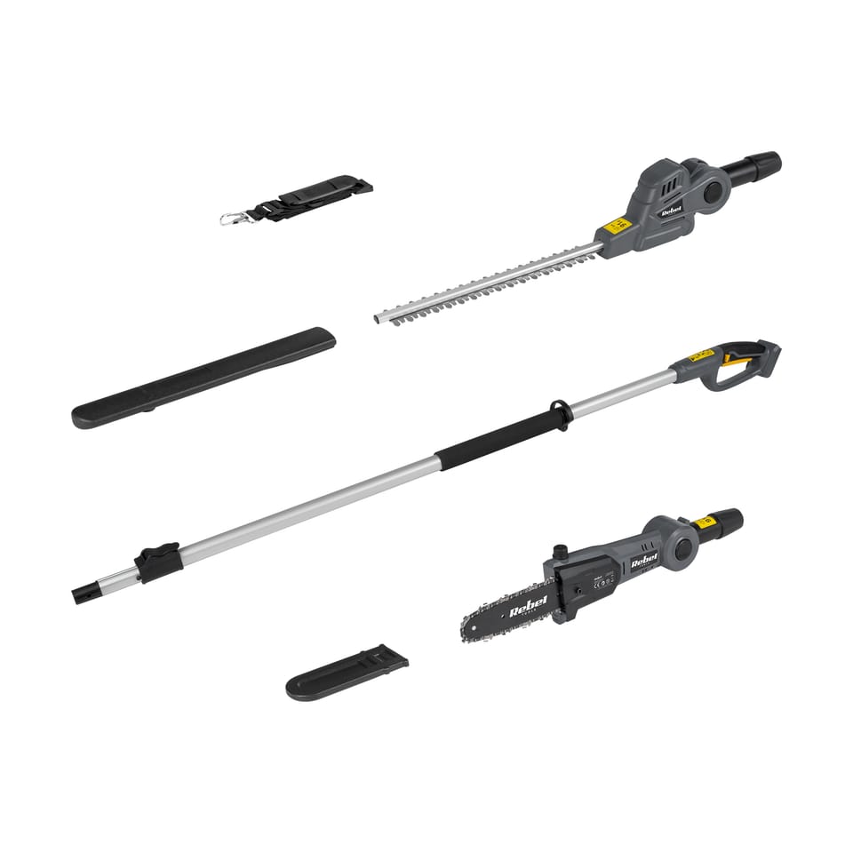 Regulowana głowicaRozkładany wysięgnik teleskopowyWłącznik z funkcją blokowaniaOsłona prowadnicyLekka i kompaktowa konstrukcjaPas ułatwiający manewrowanieAntypoślizgowa rękojeść----------DANE TECHNICZNE----------Zakres regulacji teleskopu: 214 - 274 cm*Akumulator: 20 V; 2 Ah (RB-2001) / 4 Ah (RB-2002), Li-IonCzas ładowania: 1 – 1,5 godz. (RB-2001) / 2 – 3 godz. (RB-2002)*Ładowarka sieciowa: 21,5 V; 2,2 A (RB-2001-CH)----------PARAMETRY PIŁY----------3 poziomy regulacjiPodziałka łańcucha: 9,52 mmLiczba ogniw łańcucha: 35Średnica cięcia: 16 mmIlość zębów koła napędowego: 6Długość prowadnicy: 200 mm (8'')Prędkość łańcucha: 5 m/sWaga (bez akumulatora): 2,3 kgPojemność zbiornika na olej: 60 mlPoziom ciśnienia akustycznego LPA: 81 dB (A), K= 3 dB (A)Poziom mocy akustycznej LWA: 89 dB (A), K= 3 dB (A)Drgania ręka-ramię: 2,74 m/s2 K=1,5 m/s2 / 2,69 m/s2 K=1,5 m/s2----------PARAMETRY NOŻYC----------6 poziomów regulacjiPrędkość cięcia: 1200 cięć na minutęDługość cięcia: 360 mmMaksymalna średnica cięcia: 14 mmRozstaw zębów: 23 mmWaga (bez akumulatora): 2,9 kgPoziom ciśnienia akustycznego LPA: 79,8 dB (A), K= 3 dB (A)Poziom mocy akustycznej LWA: 87,8 dB (A), K= 3 dB (A)Drgania ręka-ramię: 2,55 m/s2 K=1,5 m/s2 / 2,48 m/s2 K=1,5 m/s2W zestawie: osłona łańcucha, osłona ostrza, pasek, wysięgnik teleskopowy, instrukcja obsługi*Brak w zestawie. Akumulator i ładowarka sprzedawane są oddzielnie.