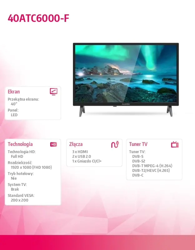 | Montaż ścienny - vesa (mm): | 200 x 200 |