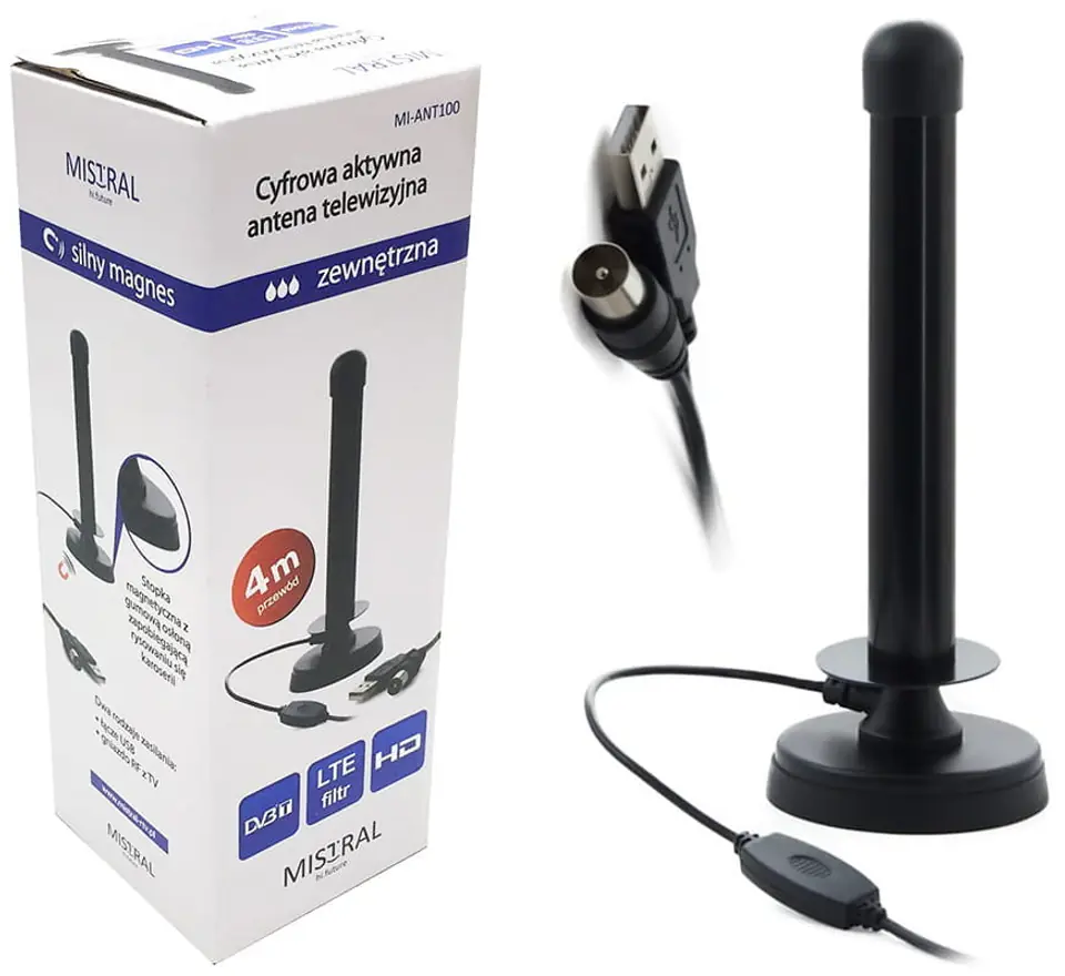 Samochodowa antena TV DVB-T marki Mistral MIANT100jest godna polecenia, ponieważ to wysokiej jakości urządzenie. Antena współpracuje z każdym odbiornikiem wyposażonym w standardowe gniazdko antenowe UHF. Jest niewielka i poręczna można ją zabrać i podłączyć wszędzie a jej dookólna praca oznacza, że nie musisz martwić się ustawianiem jej względem nadajnika. Cała konstrukcja anteny jest wodoszczelna, więc może działać nawet podczas wielkiej ulewy.