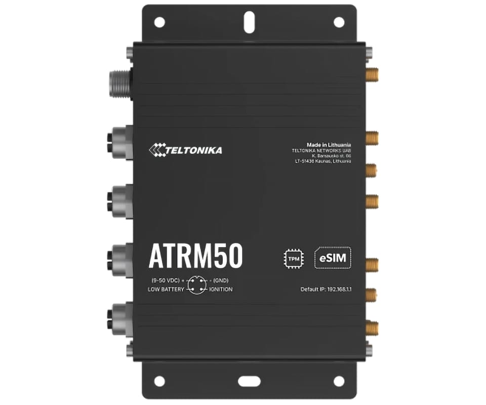 | Opis: | Teltonika Networks ATRM50 5G router for transportation with M12 connectors, dual SIM and eSIM with certificates EN 45545-2 and EN 50155 |