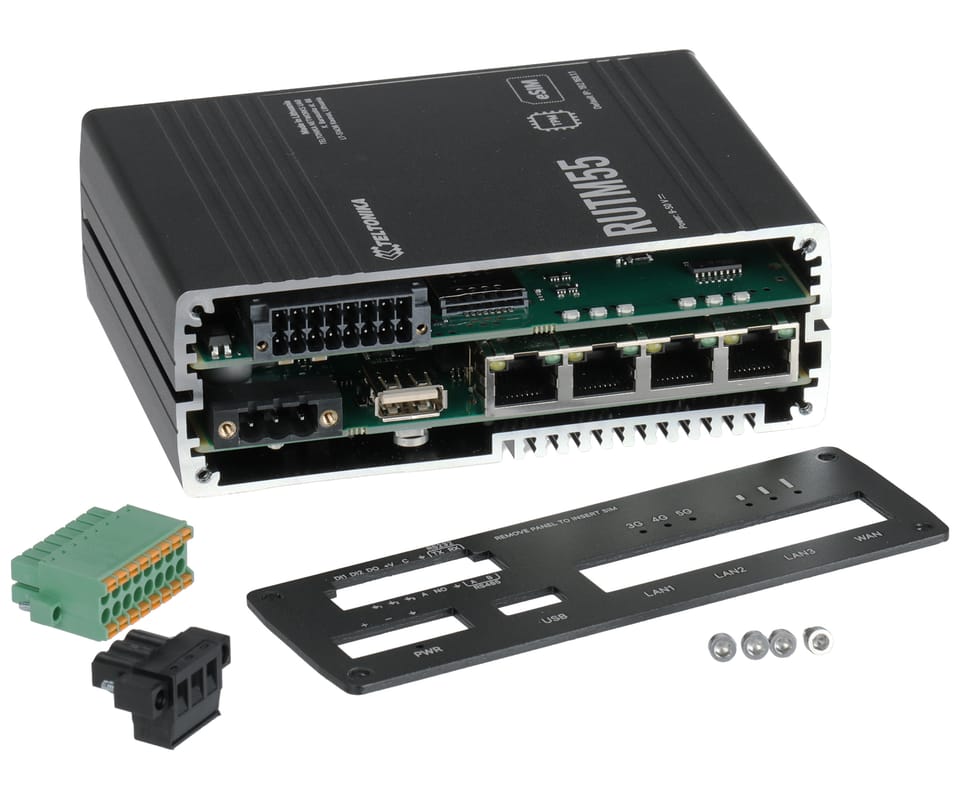 | Opis: | Teltonika Networks RUTM55 (without PSU) WiFi/5G LTE router, RS232/RS485, dual SIM, eSIM, 3-PIN power input |