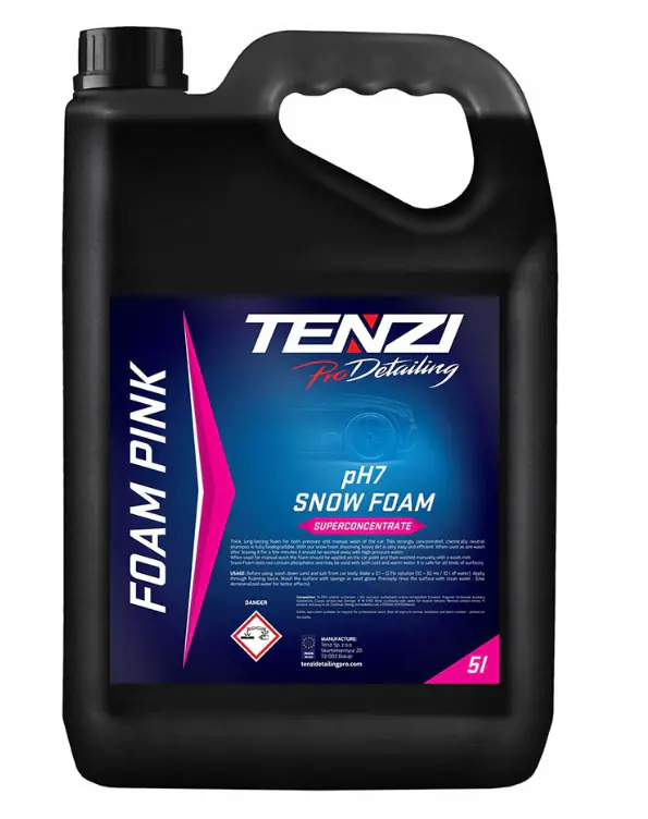 Tenzi ProDetailing Foam Pink – wysoko skoncentrowana, obfita i trwała różowa piana do ręcznego mycia karoserii. Dzięki neutralnemu pH i w pełni biodegradowalnym składnikom jest bezpieczna dla lakieru i każdego rodzaju powłok. Posiada przyjemny, wiśniowy zapach. Po myciu wstępnym należy nałożyć 0,1-0,3% roztwór przy użyciu lancy spieniającej, następnie umyć rękawicą lub miękką gąbką i spłukać wodą pod ciśnieniem.