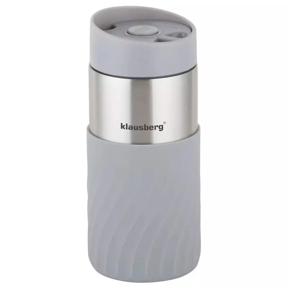 Kubek - termos nowej generacji o pojemności 300 ml firmy KLAUSBERG wykonany ze stali nierdzewnej z izolacją próżniową DOUBLE WALL. Kubek posiada odkręcana pokrywkę z wylewką Click-clack. Przycisk w pozycji OFF zamyka szczelnie kubek i działa on jak termos. Gdy przycisk jest w pozycji ON można z niego korzystać jak ze zwykłego kubka. Z dolnej części kubek wykończony opaską silikonową z falistym wzorem zapewniającą pewny chwyt. Izolacja próżniowa sprawia że kubek długo utrzymuje temperaturę wewnątrz, podobnie jak termos. Podstawa antypoślizgowa. Kubek termiczny Klausberg prezentuje się jako esencja nowoczesnego designu i funkcjonalności. Jego szary kolor w połączeniu ze srebrnymi elementami tworzy doskonałą harmonię, dodając mu nie tylko elegancji, ale też charakteru.