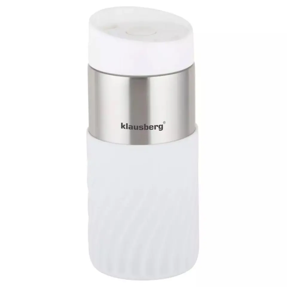 Kubek - termos nowej generacji o pojemności 300 ml firmy KLAUSBERG wykonany ze stali nierdzewnej z izolacją próżniową DOUBLE WALL. Kubek posiada odkręcana pokrywkę z wylewką Click-clack. Przycisk w pozycji OFF zamyka szczelnie kubek i działa on jak termos. Gdy przycisk jest w pozycji ON można z niego korzystać jak ze zwykłego kubka. Z dolnej części kubek wykończony opaską silikonową z falistym wzorem zapewniającą pewny chwyt. Izolacja próżniowa sprawia że kubek długo utrzymuje temperaturę wewnątrz, podobnie jak termos. Podstawa antypoślizgowa. Kubek termiczny Klausberg prezentuje się jako esencja nowoczesnego designu i funkcjonalności. Jego biały kolor w połączeniu ze srebrnymi elementami tworzy doskonałą harmonię, dodając mu nie tylko elegancji, ale też charakteru.