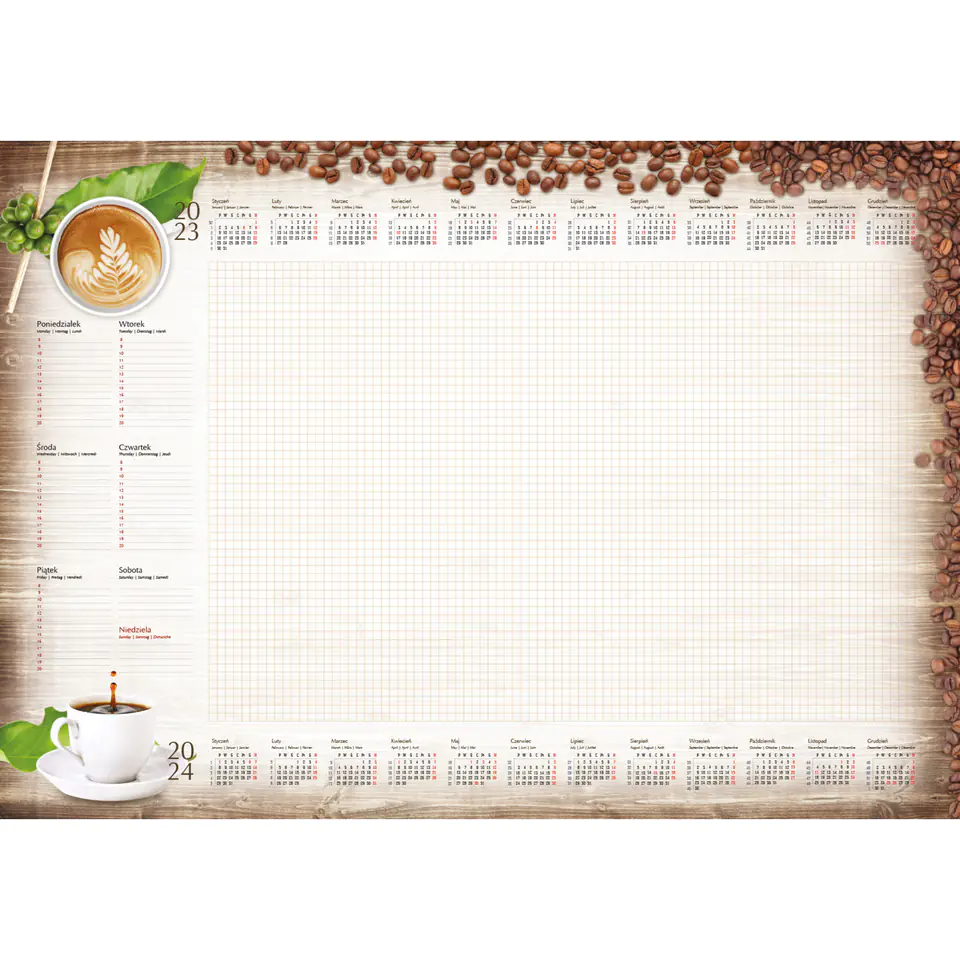 Terminarz posiada kalendarium na 2 lata umieszczone na jednej stronie, co ulatwia organizacje zarówno biezącego roku, jak i nadchodzącego.