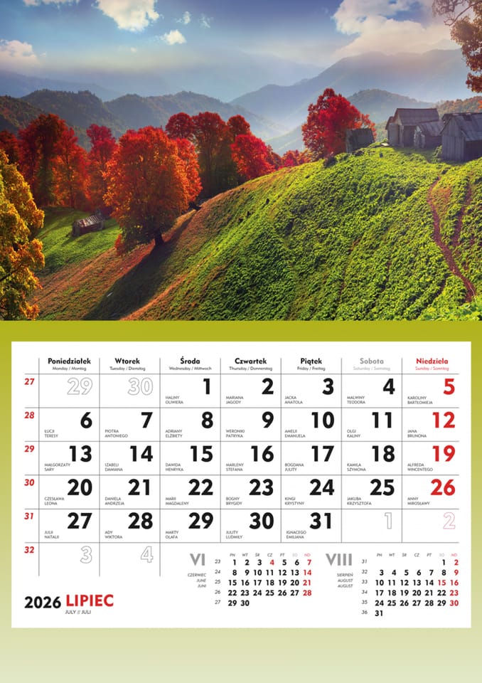 - Uklad kalendarium: 1 miesiąc - 1 kartka