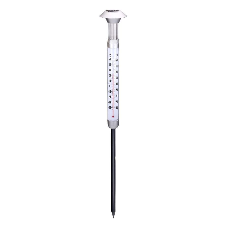 - wysoka na 56 cmdioda LED zasilana panelem słonecznymz dobrze widoczną skalą w stopniach Celsjusza i fahrenheitaczas pracy po pełnym naładowaniu 6-8 godzindo zamontowania w ziemi lub na ścianiew eleganckiej stylowej oprawie