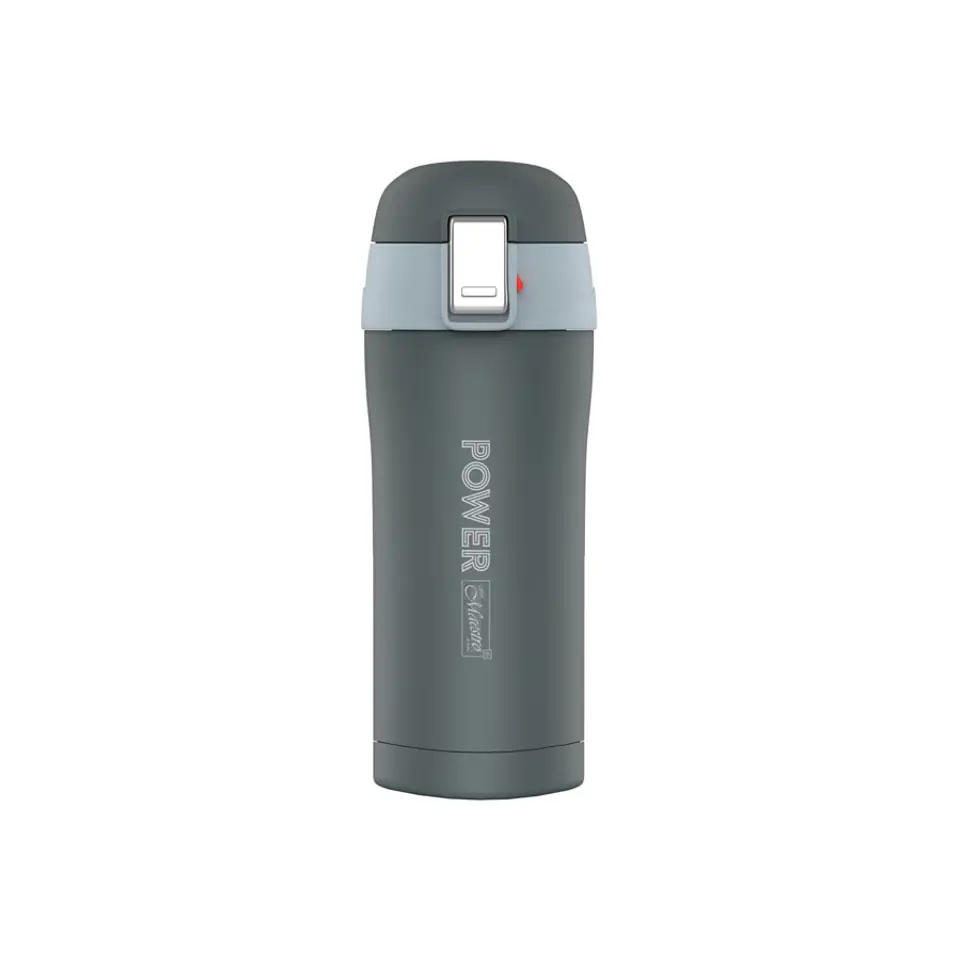 Wyposażony w korek otwierany za pomocą przycisku oraz wygodny "dziubek" do picia, umożliwia picie bez konieczności odkręcania pokrywy. Dodatkowo posiada blokadę otwierania, która zapobiega przypadkowemu wylaniu napoju. Kubek jest szczelnie zamykany dzięki podwójnej uszczelce, a jego antypoślizgowa podstawa i gumowana obudowa zapewniają stabilność oraz wygodę użytkowania.