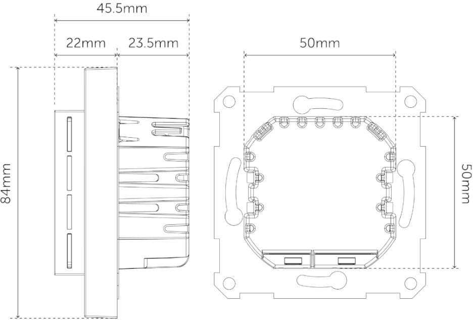 - Własne zużycie energii: Typ przełącznika: jednoprzewodowy (single pole)Zakres regulacji temperatury: 5°C – 40°CZakres pomiarowy czujnika: -10°C – 60°CTryby pracy: Heat / Cool / EcoRegulacja: histereza 0,3–3,0°C lub PWMKalibracja temperatury: ±6°CCzujniki wbudowane: czujnik temperatury pokojowejObsługiwane czujniki zewnętrzne: NTC 6.8kΩ, 10kΩ, 12kΩ, 15kΩ, 22kΩ, 33kΩ, 47kΩ, 100kΩMaks. długość czujnika NTC: 50 mPomiar energii: aktywny pomiar mocy (W) i zużycia (kWh)Montaż: puszka podtynkowa Ø60, ramki System 55Stopień ochrony: IP21 (dopuszczony do łazienek)Kolor: White RAL 9003Materiał ramy: metalowa rama montażowaWymiary: 84 × 84 × 45,5 mmWaga: 135 gTemperatura pracy: 5°C – 40°CTemperatura przechowywania: -30°C – 70°CWilgotność: 10–85% RH (bez kondensacji)Certyfikaty: CE, Z-Wave Plus v2, NemkoAktualizacja oprogramowania: OTAFunkcje bezpieczeństwa: ochrona przed przegrzaniem, przeciążeniem, błędem czujnika