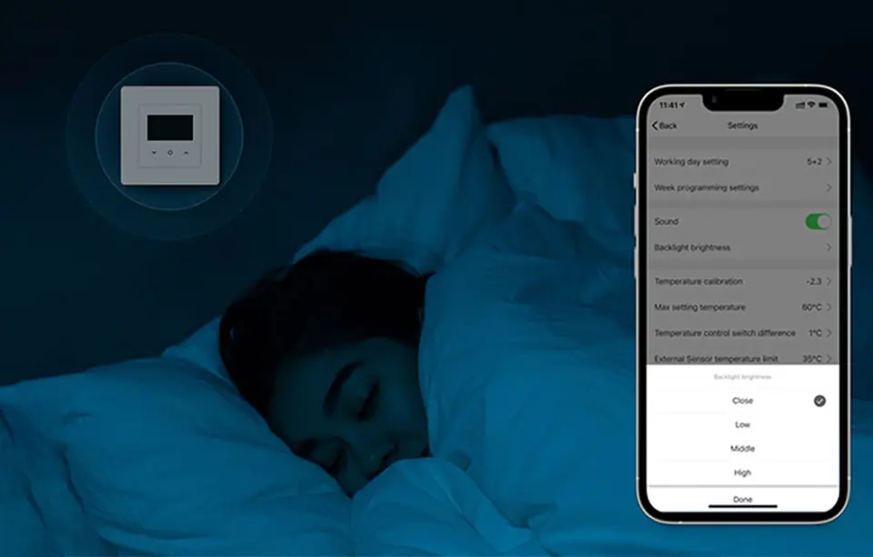 Kolejną zaletą Avatto WT200 jest wyświetlacz LCD. Z jego poziomu dowiesz się o ustawionym trybie pracy, połączeniu z siecią, ustawionej temperaturze czy włączonej blokadzie bezpieczeństwa. Co więcej, termostat wyświetla aktualną godzinę. Dzięki temu wszystkie najważniejsze informacje masz w zasięgu ręki – wystarczy, że rzucisz okiem! Możesz też ustawić jasność ekranu lub całkowicie go wyłączyć.