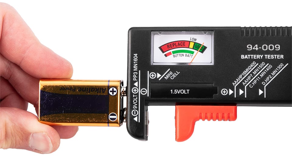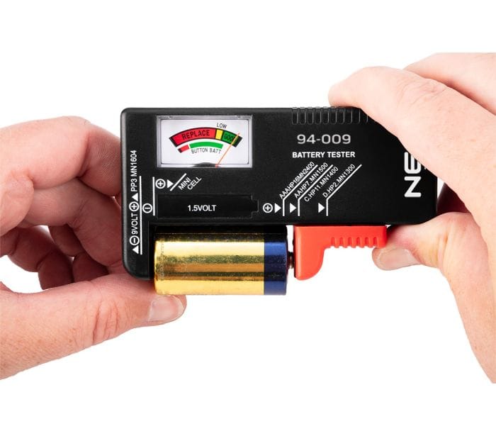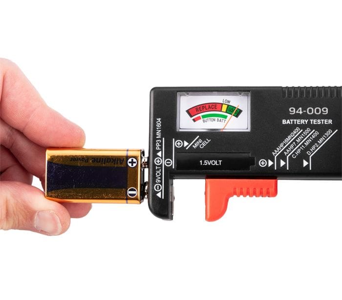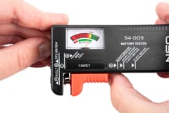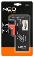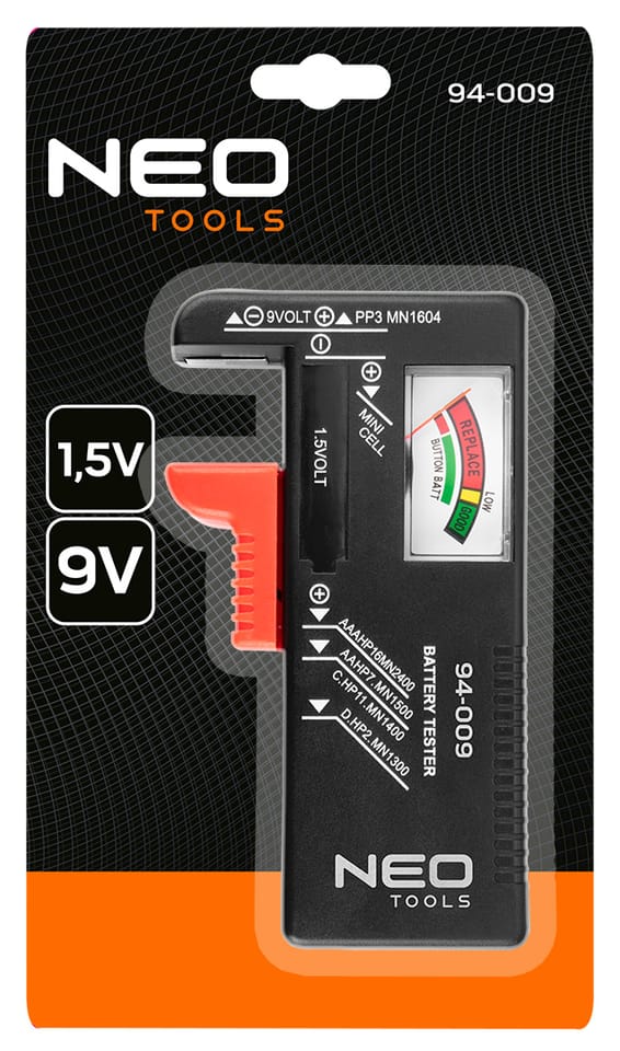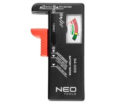 Tester baterii i akumulatorków do ogniw 1.5V i 9V, kompatybilne baterie: AA(R6), AAA(R3), R14 , R20, baterie typu pastylki (CR) 1,5V, baterie 9V (R9), wymiar 113x64x30mm, waga 47gr, zasilanie ze sprawdzanej baterii, wynik na wyświetlaczu czerwony; wymień baterię, zółty; niski poziom naładowania, zielony bateria dobra