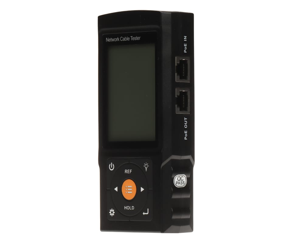 CS-NT32C to wielofunkcyjny tester kabli do instalacji i serwisu sieci. Wykrywa usterki złączy RJ45, sprawdza kolejność i ciągłość żył, zwarcia oraz długość przewodu do 600 m. Ma lokalizator kabli (UTP/BNC) i detektor PoE IEEE802.3af/at/bt z pomiarem napięcia i mocy PSE oraz ekran o rozmiarze 3".
