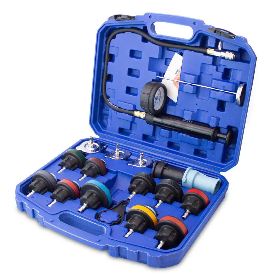 Tester szczelności układu chłodzenia pasuje do większości popularnych modeli i marek pojazdów z Europy, Azji i USA. Za pomocą tego testera szczelności układu chłodzenia można szybko sprawdzić i przetestować układ chłodzenia pojazdu. Prosty i nieskomplikowany zestaw do testowania układu chłodzenia składający się z manometru z pompką i różnych adapterów do wielu modeli pojazdów.