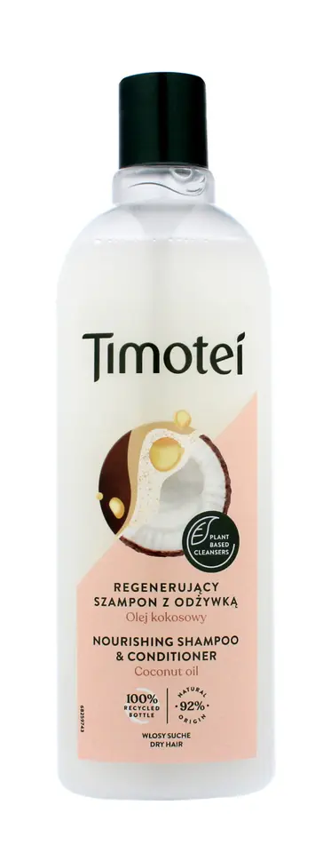 Szampon z odżywką wzbogacony o w 100% naturalny ekstrakt z oleju kokosowego.Pozwól Timotei odkryć i pielęgnować naturalne piękno Twoich włosów. Wzbogacone o ekstrakty z naturalnego oleju kokosowego Timotei 2w1 Intensywna Pielęgnacja myje, odżywia i wygładza Twoje włosy.