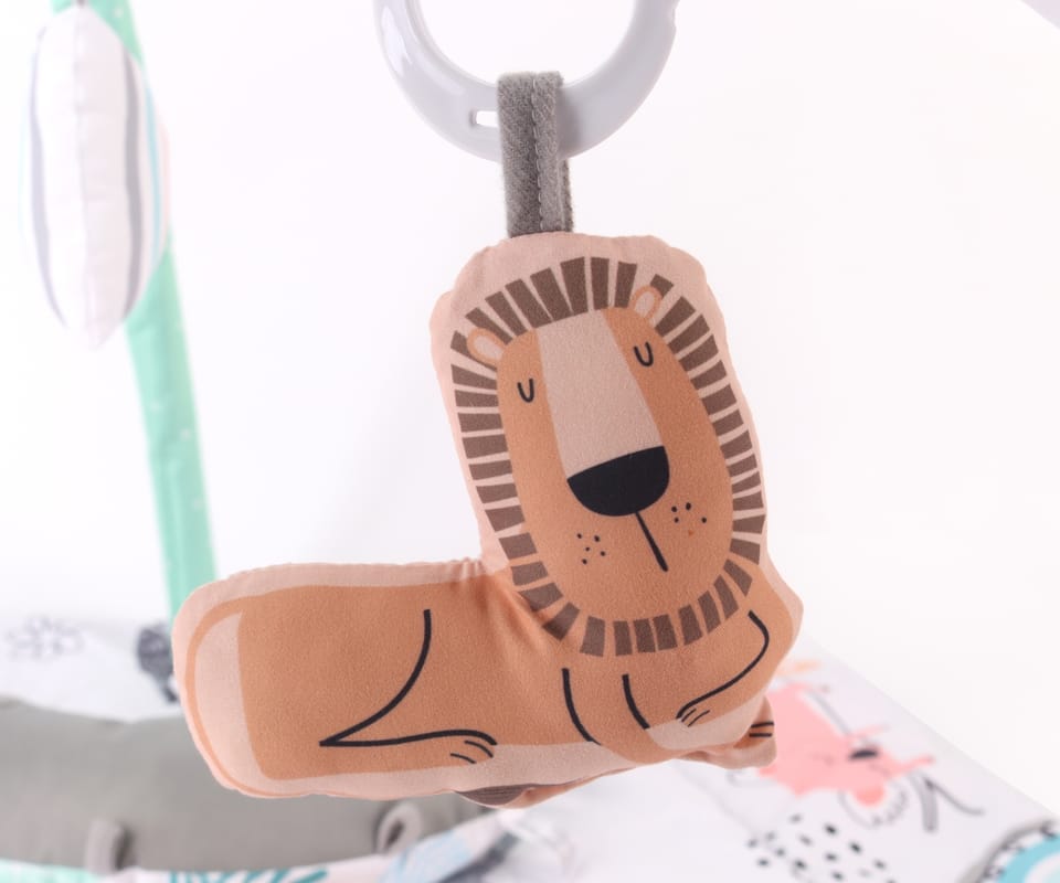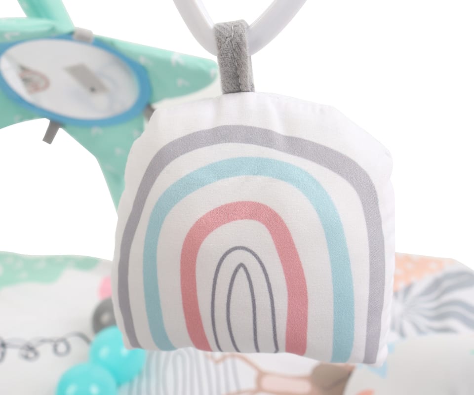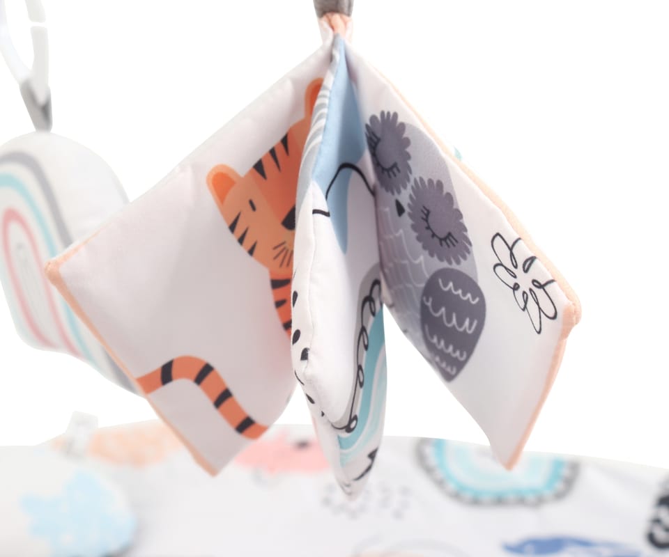 Bogate wyposażenie i elementy sensoryczneW zestawie znajduje się wszystko, czego potrzebuje mata edukacyjna dla niemowląt: