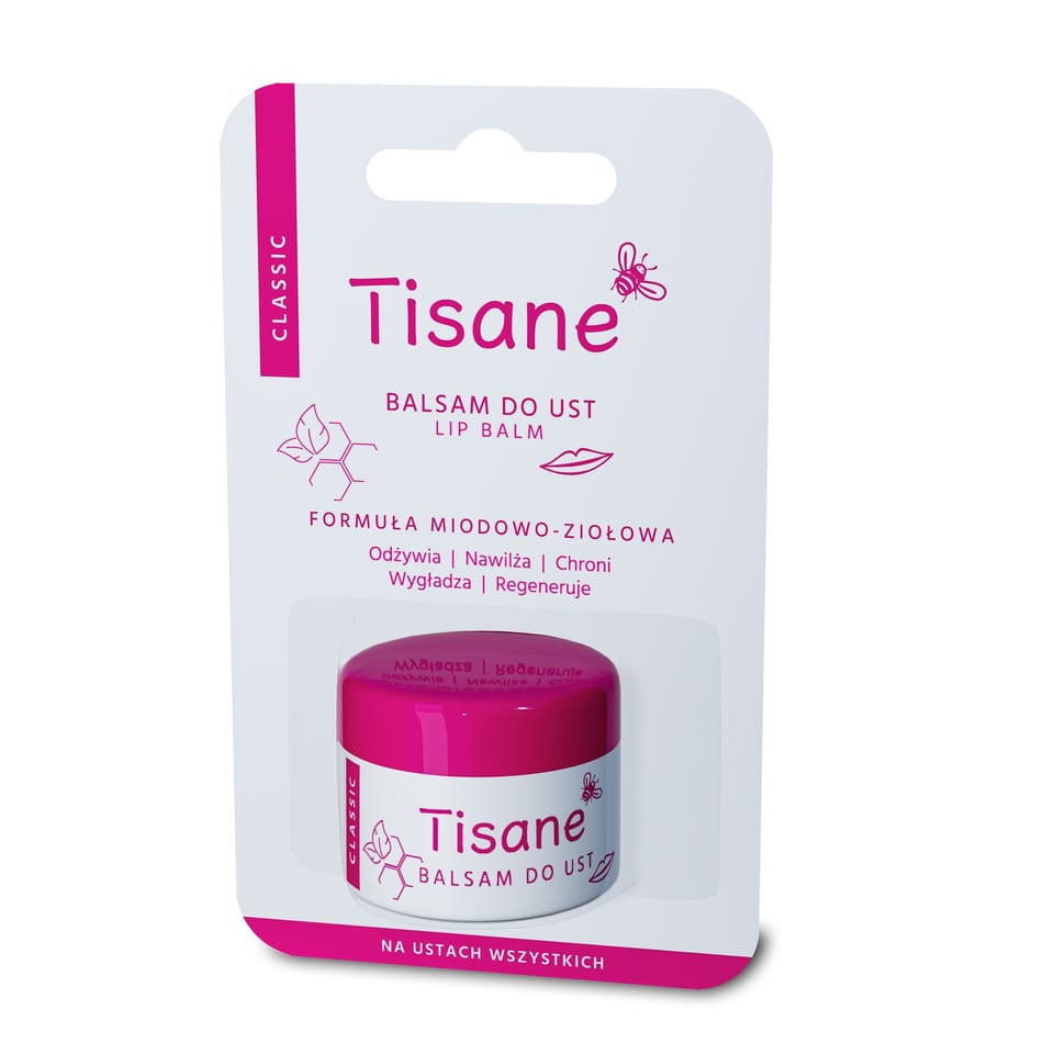 Kosmetyk ziołowy o miodowym smaku i waniliowym zapachu. Odżywia. Nawilża. Chroni. Wygładza. Regeneruje. 4,7 g. Kosmetyk Tisane Classic Słoik (Blister) w postaci balsamu do ust w słoiczku to produkt działający nawilżająco, odżywiająco, regenerująco, wygładzająco i ochronnie. Balsam do ust ziołowo-miodowy Tisane Classic Słoik (Blister) w swojej składzie ma składniki aktywne pochodzenia naturalnego, w tym ekstrakty ziołowe oraz miód i wosk pszczeli, które uzupełniono w oleje roślinne i witaminę E. Na co jest Tisane Classic Słoik (Blister)? Wskazaniem do stosowania kosmetyku jest pielęgnacja ust, które mają tendencję do wysuszania się, pierzchnięcia i bolesnego pękania. Kosmetyk można stosować jednak nie tylko na usta, ale również na inne partie skóry przesuszonej i szorstkiej, a także na otarcia skóry. Balsam Tisane Classic Słoik (Blister) ma działanie regenerujące, dzięki czemu znajduje zastosowanie przy opryszczce oraz przy skórze podrażnionej lub uszkodzonej. Można stosować go również w celu ochrony skóry ust przed niekorzystnym działaniem słońca, wiatru, deszczu czy mrozu. Rozprowadzony na ustach sprawia, że stają się one wygładzone i mniej podatne na pierzchnięcie oraz pękanie. W opakowaniu znajduje się 4,7 g balsamu do ust Tisane Classic Słoik (Blister). W skład kosmetyku wchodzi witamina E, miód oraz wosk pszczeli, a także ekstrakt z ostropestu, melisy i jeżówki, a oprócz tego olej rycynowy i olej z oliwek. Skład kosmetyku uzupełniony jest przez składniki pomocnicze, a ich szczegółowa lista podana jest na opakowaniu produktu. Balsam do ust można w celach pielęgnacyjnych stosować codziennie, nawet kilka razy dziennie, gdy jest to wskazane. Szczególnie zaleca się jego aplikację na usta w czasie aktywności na świeżym powietrzu. Tisane Classic Słoik (Blister) należy na skórę ust nakładać w niewielkiej ilości, dokładnie rozprowadzając go po całych wargach i jednocześnie delikatnie masując usta, aby składniki czynne kosmetyku lepiej się wchłonęły w naskórek. W podobny sposób należy postępować, jeśli balsam Tisane Classic Słoik (Blister) stosowany będzie na inne obszary skóry przesuszonej czy otarcia.