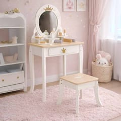 Toaletka posiada wszystkie udogodnienia prawdziwego mebelka – duże, okrągłe lusterko oraz półki i szufladę na kosmetyczne akcesoria. Oraz praktyczny taboret, który ułatwi wykonywanie „makijaży” w wygodnej pozycji.