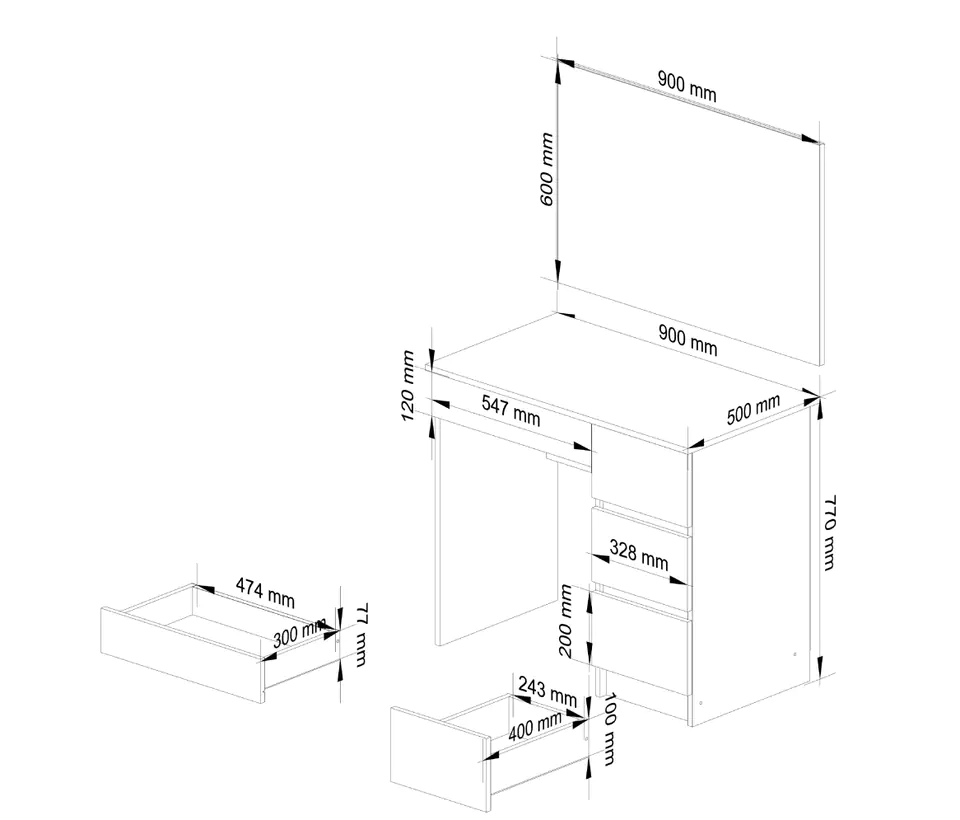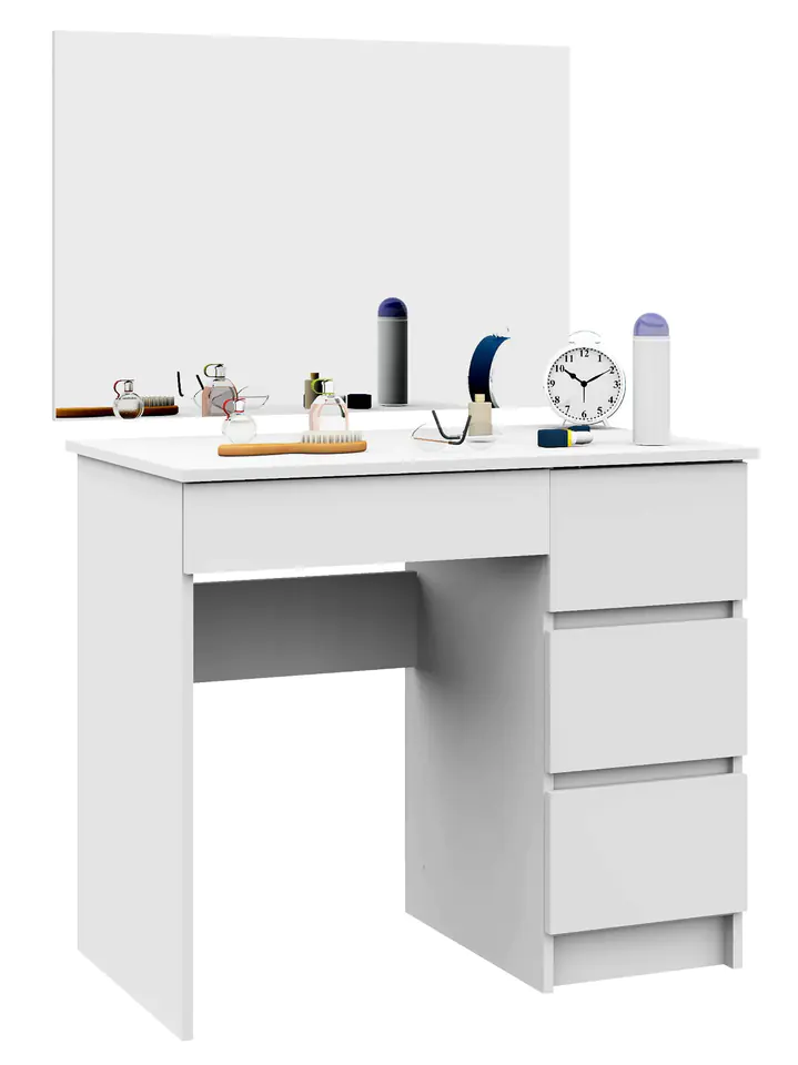 Toaletka kosmetyczna z lustrem to doskonały mebel do wykonywania makijażu. Toaletka posiada funkcjonalny blat, na którym można wyłożyć najpotrzebniejsze rzeczy oraz cztery pojemne szuflady, które pomieszczą wszystkie drobiazgi. W zestawie z dopasowanym rozmiarem lustrem toaletka stwarza idealne warunki do wykonywania makijażu, a codzienna kobieca rutyna od tej pory sprawi dużo więcej przyjemności. Odpowiednie wymiary toaletki (77 cm wysokości, 90 cm szerokości, 50 cm głębokości) zapewniają komfortowe przemieszczanie się oraz korzystanie z toaletki. Obszerne lustro (60 cm na 90 cm) pozwoli na precyzyjne wykonanie nawet najbardziej skomplikowanych zabiegów pielęgnacyjnych. Zestaw ten sprawdzi się nawet w niewielkiej przestrzeni. Toaletka wykonana została z wytrzymałej, odpornej na ścieranie i uszkodzenia płyty laminowanej, a neutralny, modny biały kolor sprawia, że dopasuje się do każdego wnętrza. Idealny mebel do sypialni lub innego pomieszczenia, który ucieszy każdą dbającą o urodę kobietę.