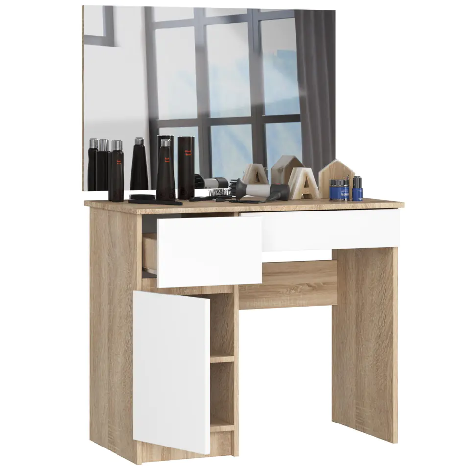 Toaletki kosmetyczne wcale nie muszą być passé. Najlepszym dowodem na to jest mebel z lustrem P-2/SL z naszej oferty. To idealna propozycja dla Pań, które marzą o miejscu, gdzie mogą przetrzymywać swoje kosmetyki oraz wykonywać makijaż i czesać włosy. Toaletka dąb sonoma z frontami białymi dedykowana jest do sypialni, choć świetnie sprawdzi się także w salonach kosmetycznych, gdzie duże lustro gwarantuje wygodne warunki pracy dla modelki oraz makijażystki.