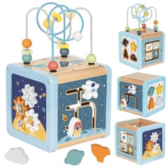 Drewniana Kostka Aktywności Kosmos od marki Tooky Toy to edukacyjny, kompleksowy zestaw w delikatnych pastelowych kolorach. Kostka aktywności jest wielostronna, oferując różnorodne interaktywne panele na każdej ze stron. Znajdują się na niej zębatki, klocki sortery i suwaki, które nie tylko pobudzają ciekawość dziecka, ale także rozwijają jego umiejętności motoryczne. Labirynt z koralikami to doskonałe narzędzie do poprawy koordynacji wzrokowo-ruchowej u dzieci. Część z labiryntem można schować wewnątrz kostki, co ułatwia przechowywanie.