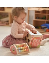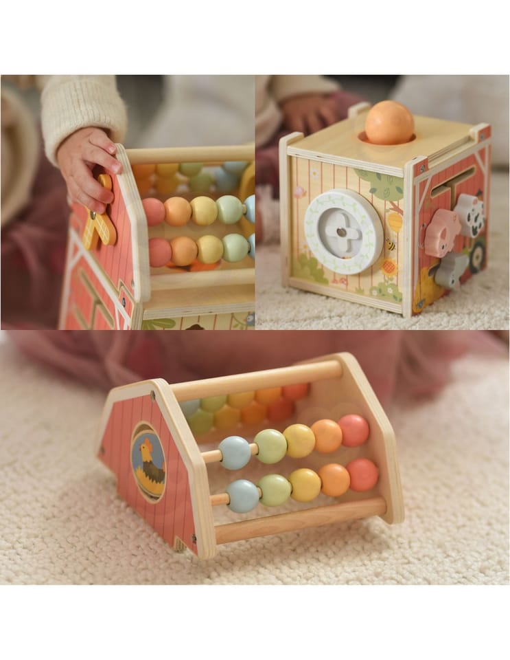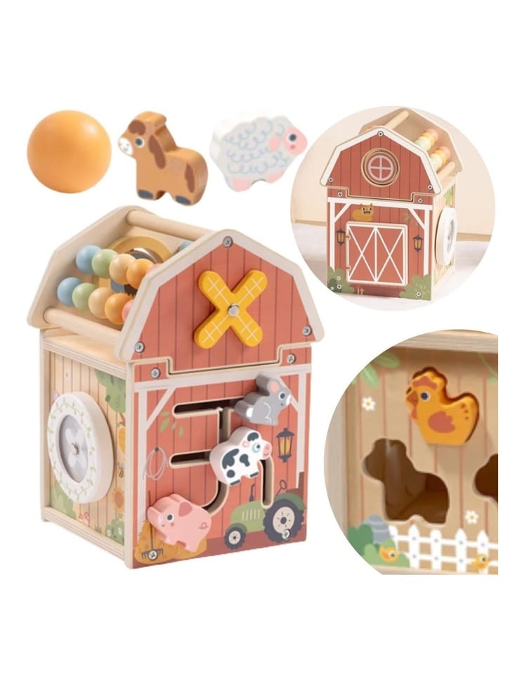 TOOKY TOY Drewniana Kostka Farma Aktywności Sorter Liczydło MontessoriDrewniana stodoła aktywności marki Tooky Toy, to drewniany sorter w kształcie stodoły, który kryje w sobie mnóstwo niespodzianek! Ten czarujący drewniany sorter w kształcie stodoły to idealna propozycja dla najmłodszych odkrywców. Otwierane drzwiczki, ruchome elementy, kolorowe liczydło umieszczone na dachu oraz urocze figurki zwierzątek – każda strona zabawki to nowa przygoda, która angażuje dziecko i zachęca do aktywnej zabawy. Dzięki przemyślanej konstrukcji łączącej różnorodne aktywności, ta drewniana stodoła zapewnia wielogodzinną, wartościową rozrywkę, która wspiera rozwój Twojego malucha na wielu płaszczyznach.