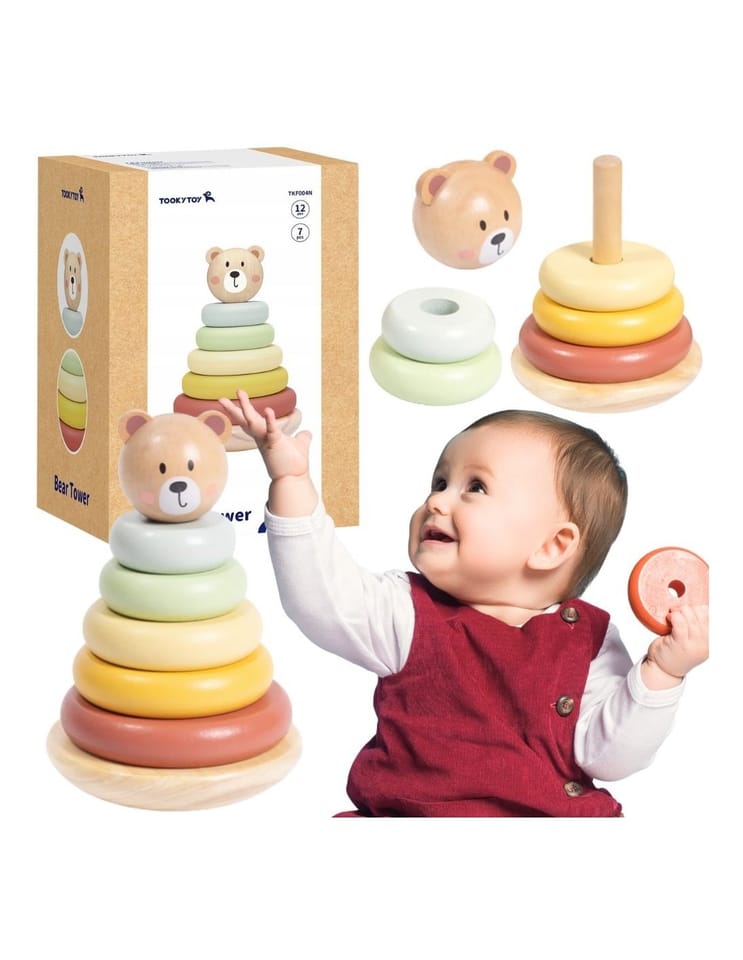 Drewniana wieża z krążkami i sympatyczną główką misia marki Tooky Toy to zabawka, która łączy w sobie radość kreatywnej zabawy i wsparcie rozwoju dziecka. Jasne, pastelowe kolory, solidne wykonanie oraz możliwość układania elementów na wiele sposobów sprawiają, że to nie tylko klasyczna piramidka, lecz także inspiracja do odkrywania, eksperymentowania i nauki poprzez ruch i wyobraźnię. Maluch może budować, burzyć i tworzyć własne konstrukcje, jednocześnie ćwicząc zwinność palców.
