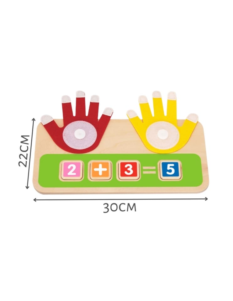 - - Drewniana podstawa z dwoma ruchomymi dłońmi (czerwoną i żółtą) imitującymi liczenie na palcach