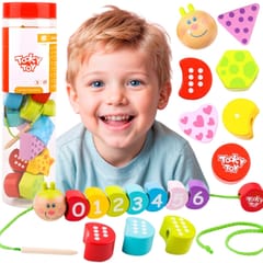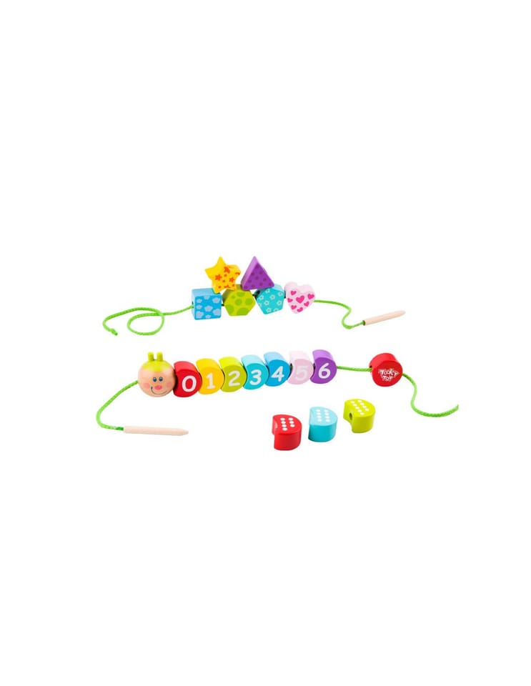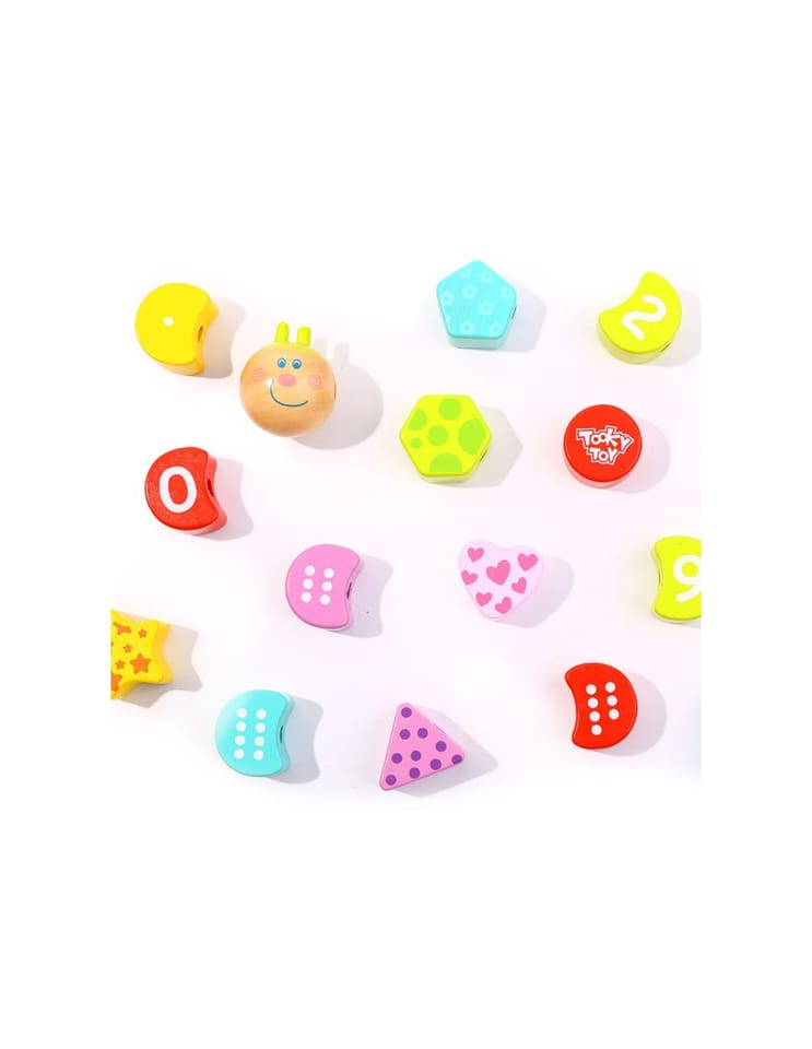 TOOKY TOY Sznurowana Gąsienica drewniana zabawka dla dzieci, dzięki której stworzą uroczą kolorową gąsienicę z jasną uśmiechniętą buźką. To świetna gra rozwijające zdolności motoryczne, które są niezbędne do wczesnego rozwoju. Zabawka zapewni wiele godzin zabawy, przeciągając wełnę przez otwory. Każdy element wykonany jest z dobrej jakości drewna i pomalowany nietoksyczną farbą. Nawlekanie i sznurowanie rozwija koordynację małych palców i cierpliwości. Ta drewniana zabawka edukacyjna daje wiele możliwości, takich jak zasznurowanie cyfr w odpowiedniej kolejności rosnącej lub malejącej, zasznurowanie tylko liczb parzystych, a także rozpoznawanie kolorów i kształtów. Brak ostrych krawędzi sprawia, że produkt jest w 100% bezpieczny dla dziecka.