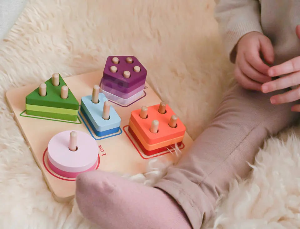 TOOKY TOY Drewniany Sorter Geometryczny zabawka edukacyjna do nauki liczenia oraz rozróżniania kształtów i kolorów. Na każdym z pięciu trzonków trzeba umieścić odpowiednie kształty, a utrudnienie z pozoru prostej zabawy polega na tym, że klocki trzeba dopasować do odpowiednich wypustek. Na drewnianej podstawie dodatkowo domalowano 5 cyfr i nazw kształtów w języku angielskim, który jest świetnym wstępem do oswajania malucha z językiem obcym. Podczas zabawy dziecko rozwija zdolności manualne, koordynację ręka-oko oraz umiejętność logicznego myślenia. Żywe kolory przykuwają wzrok malucha i stymulują ten zmysł. Sorter został pozbawiony ostrych krawędzi, a zastosowanie nietoksycznych farb zapewnia bezpieczeństwo dla dzieci i środowiska.