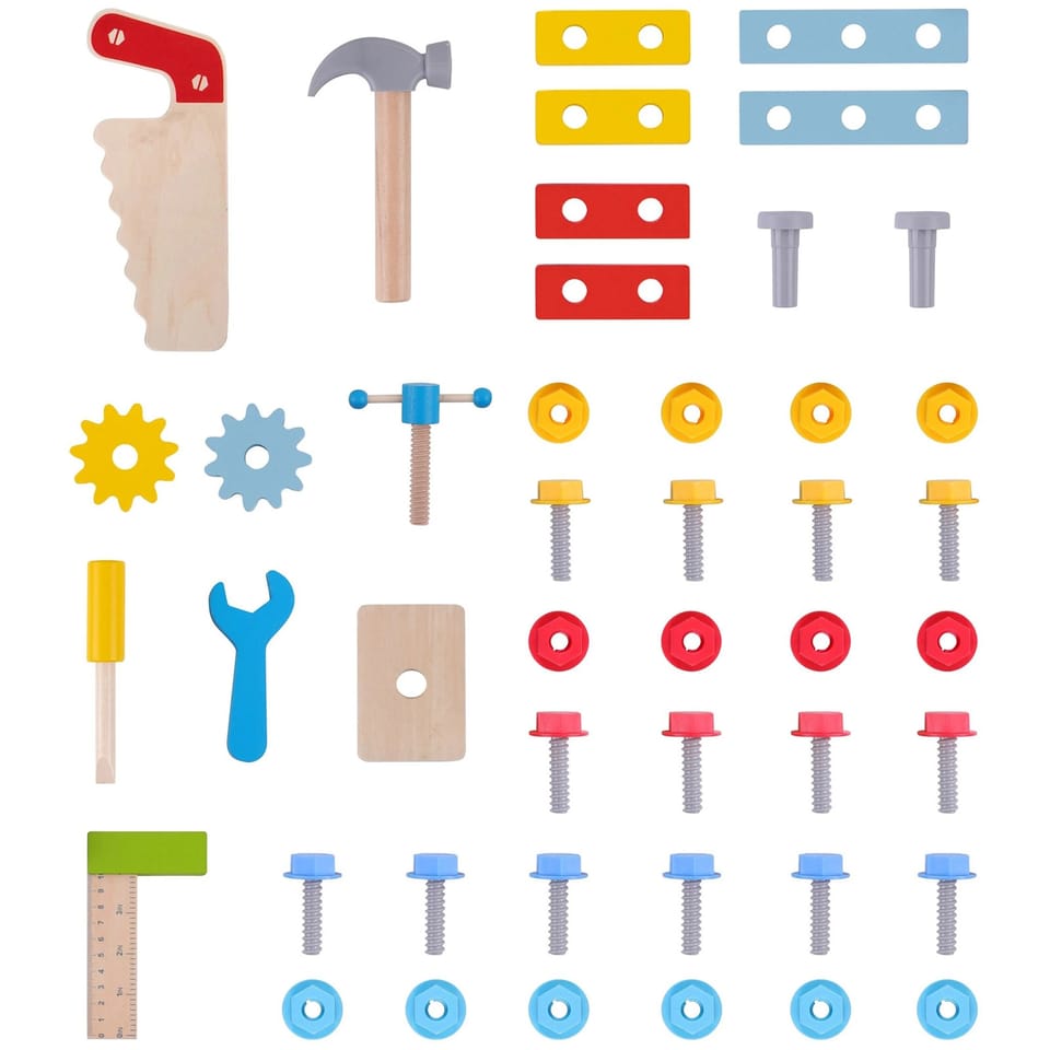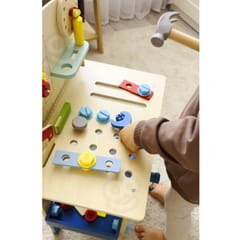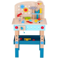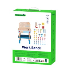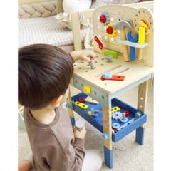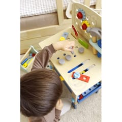 Stół Do Majsterkowania od marki TOOKY TOY będzie spełnieniem marzeń małej złotej rączki. W zestawie znajdziemy stolik wraz z różnorakimi zabawkowymi narzędziami: piłą, młotkiem, kluczem, śrubokrętem, imadełkiem, miarką, śrubkami, nakrętkami podkładkami i kołami zębatymi. Dzięki półkom i uchwytom stołu, dziecko będzie miało pod ręką niezbędne narzędzia i akcesoria, a elementy zestawu można mocować do stolika. Zabawka wykonana w sposób bezpieczny dla dzieci, rogi i krawędzie są zaokrąglone, by nie było ryzyka skaleczenia się.