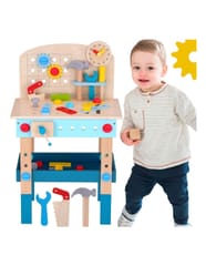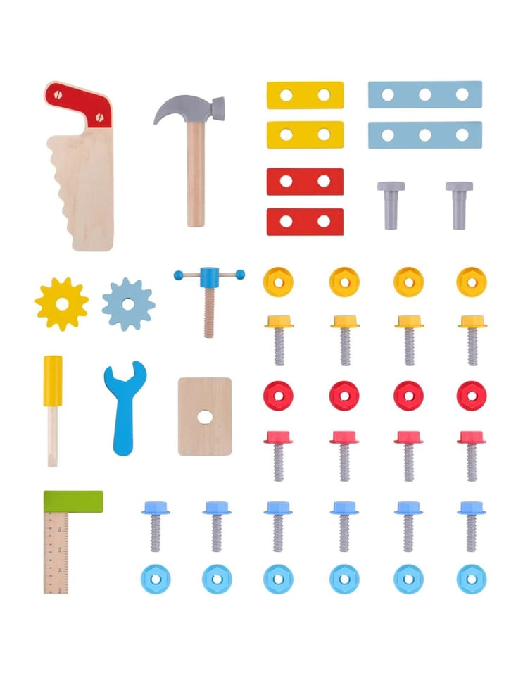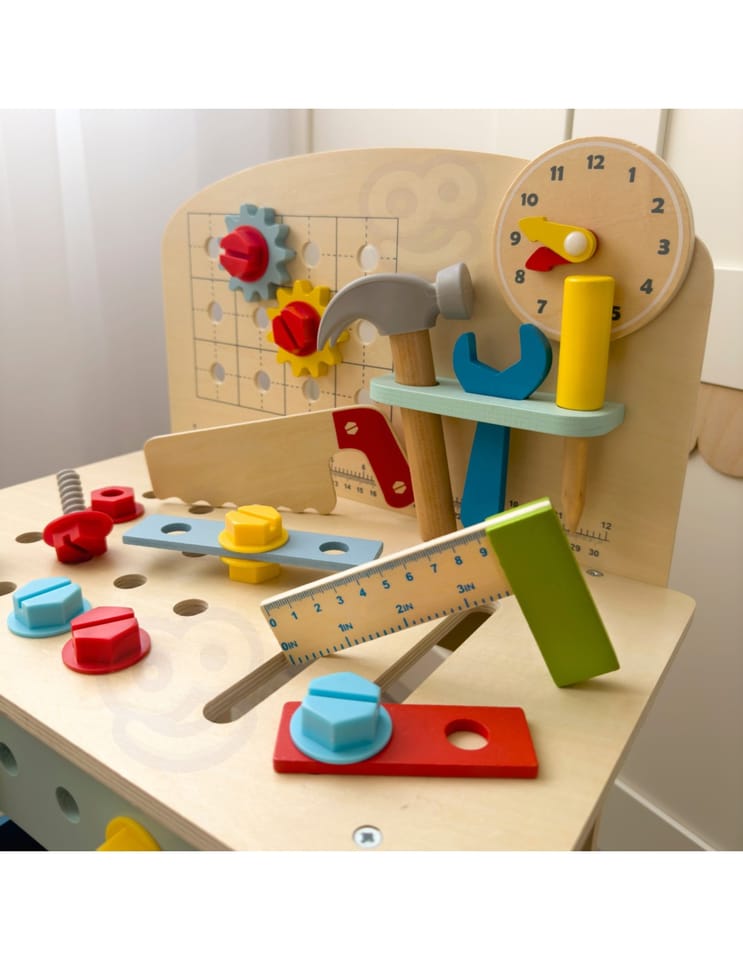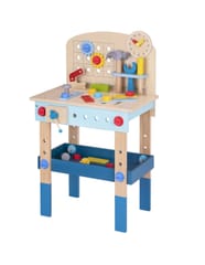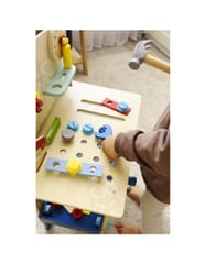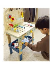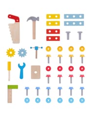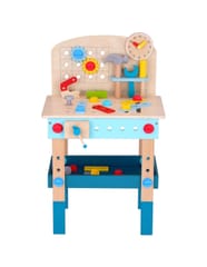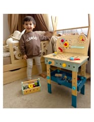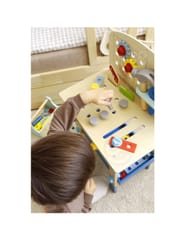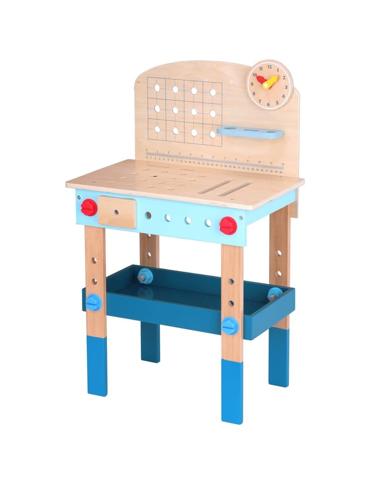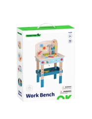 Stół Do Majsterkowania od marki TOOKY TOY będzie spełnieniem marzeń małej złotej rączki. W zestawie znajdziemy stolik wraz z z różnorakimi zabawkowymi narzędziami: piłą, młotkiem, kluczem, śrubokrętem, imadełkiem, miarką, śrubkami, nakrętkami podkładkami i kołami zębatymi. Dzięki półkom i uchwytom stołu, dziecko będzie miało pod ręką niezbędne narzędzia i akcesoria, a elementy zestawu można mocować do stolika. Zabawka wykonana w sposób bezpieczny dla dzieci, rogi i krawędzie są zaokrąglone, by nie było ryzyka skaleczenia się.