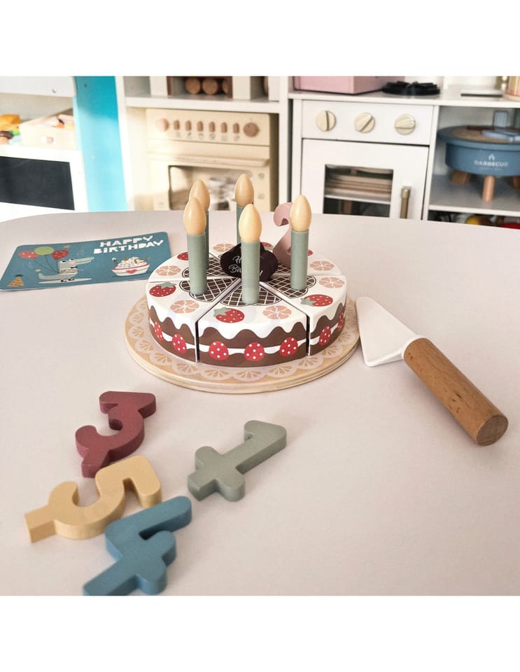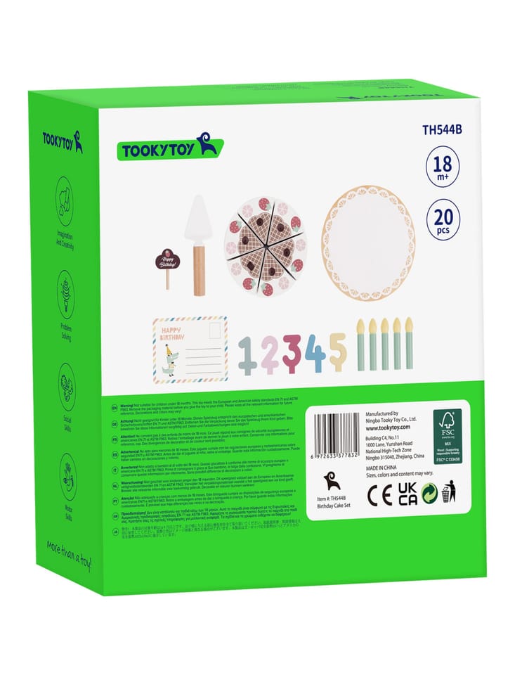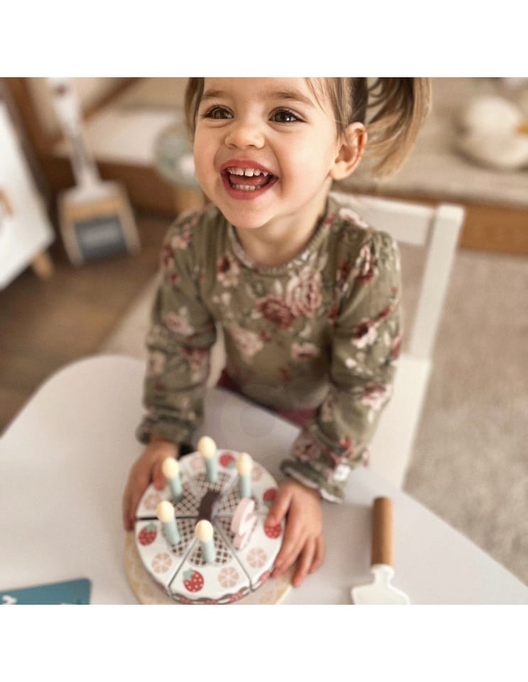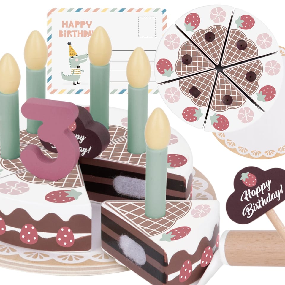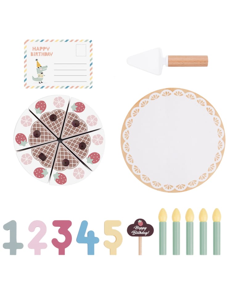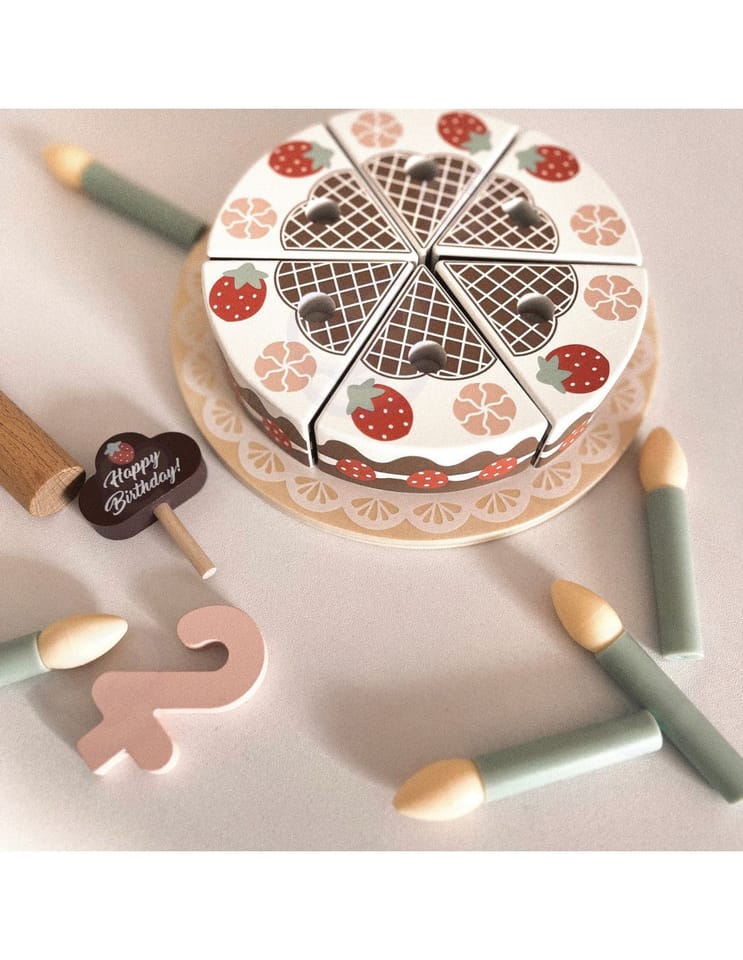 Drewniany Piękny Czekoladowy Urodzinowy Tort z truskawkami i bezami marki Tooky Toy to nie tylko uroczy dodatek do dziecięcej kuchni, ale także doskonały element dekoracyjny na przyjęciu urodzinowym. Składa się z 20 starannie wykonanych drewnianych elementów, każdy fragment tortu łączy się ze sobą za pomocą wytrzymałych rzepów, zapewniając solidną konstrukcję. Dodatkowo zestaw zawiera świeczki, cyfry od 1 do 5, kartkę urodzinową oraz specjalną łyżkę do ciasta.
