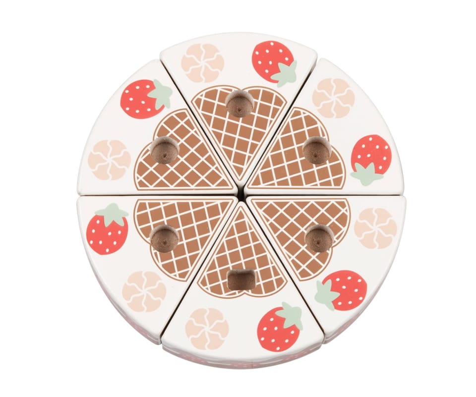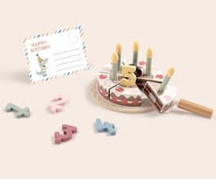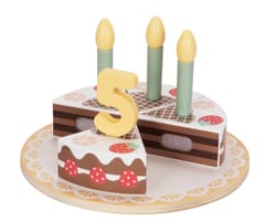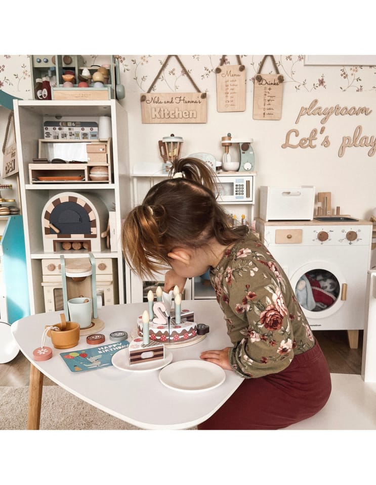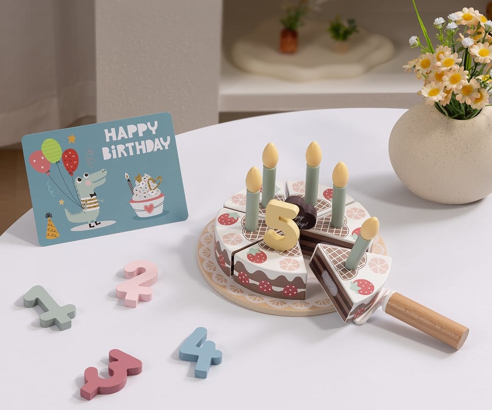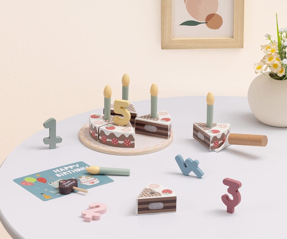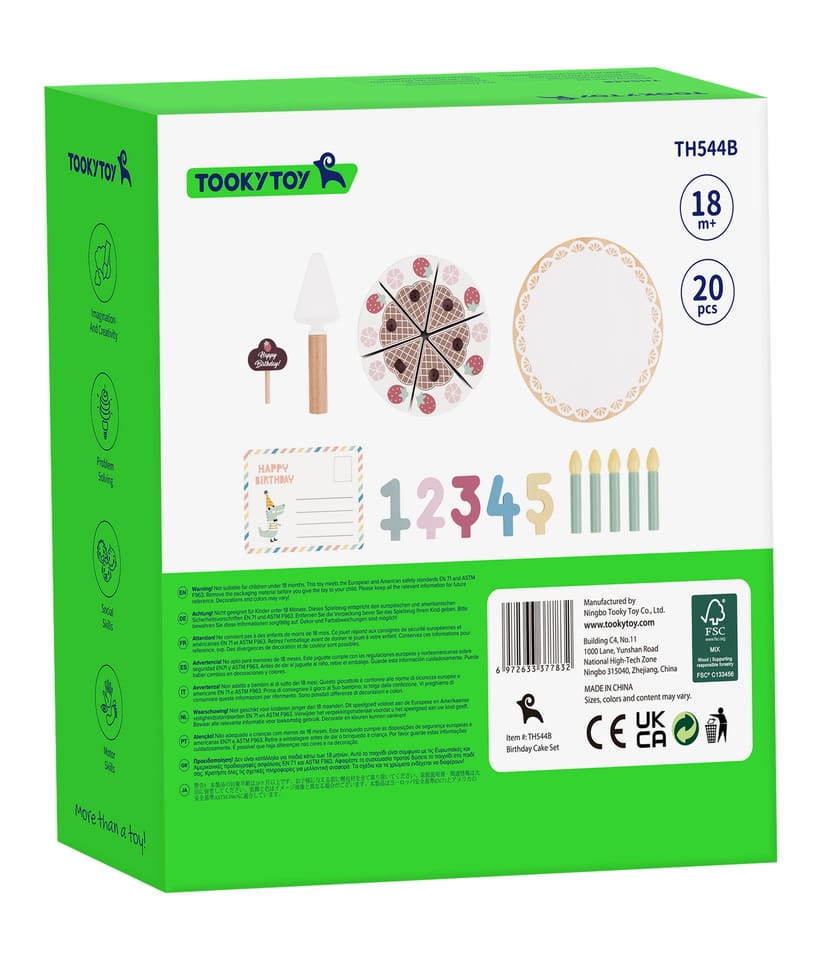 Drewniany Piękny Czekoladowy Urodzinowy Tort z truskawkami i bezami marki Tooky Toy to nie tylko uroczy dodatek do dziecięcej kuchni, ale także doskonały element dekoracyjny na przyjęciu urodzinowym. Składa się z 20 starannie wykonanych drewnianych elementów, każdy fragment tortu łączy się ze sobą za pomocą wytrzymałych rzepów, zapewniając solidną konstrukcję. Dodatkowo zestaw zawiera świeczki, cyfry od 1 do 5, kartkę urodzinową oraz specjalną łyżkę do ciasta.
