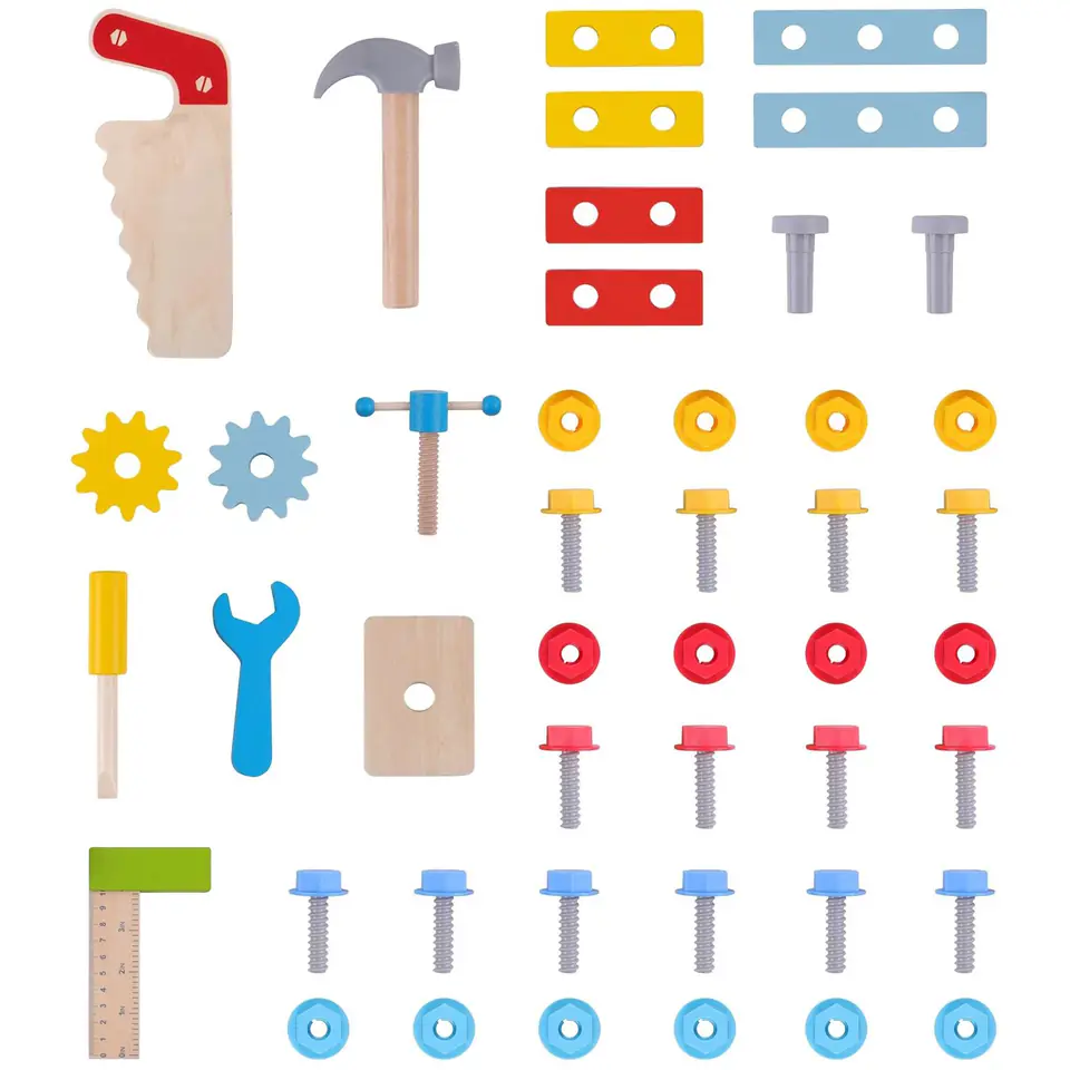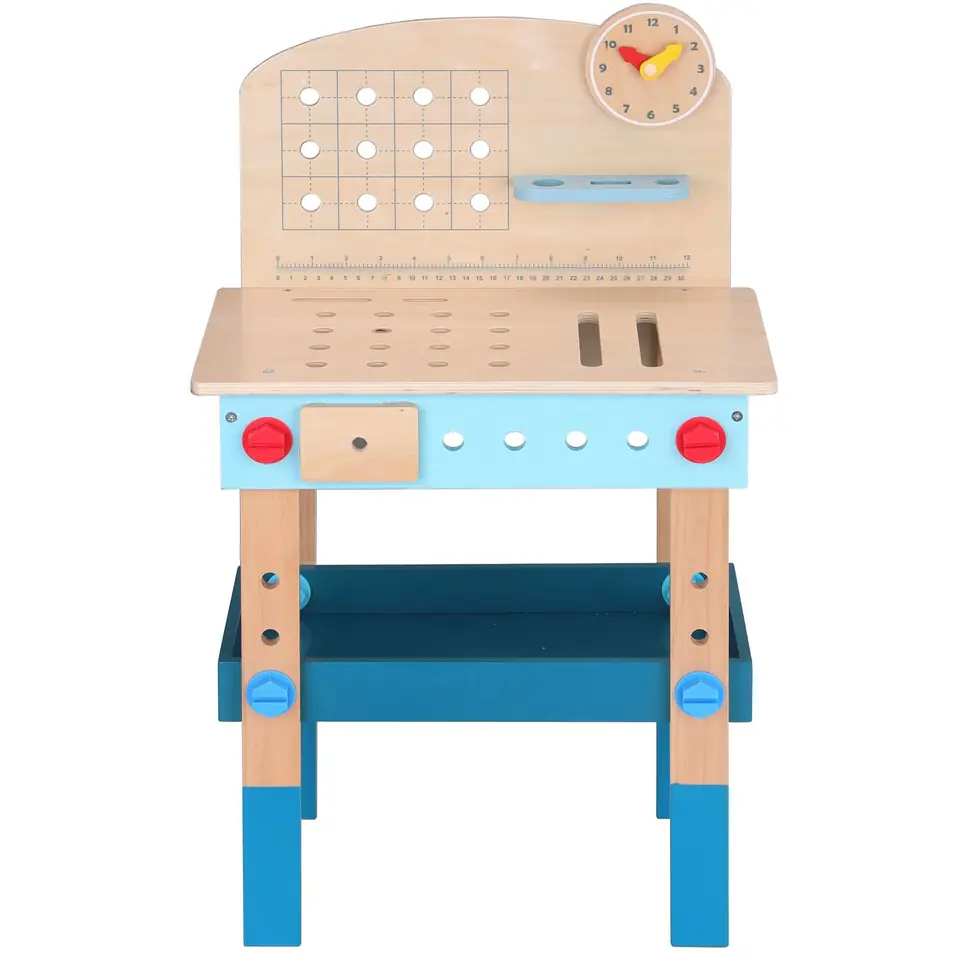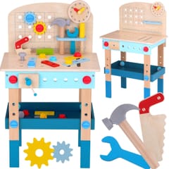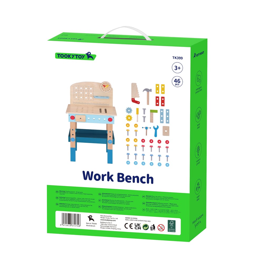Stół Do Majsterkowania od marki TOOKY TOY będzie spełnieniem marzeń małej złotej rączki. W zestawie znajdziemy stolik wraz z różnorakimi zabawkowymi narzędziami: piłą, młotkiem, kluczem, śrubokrętem, imadełkiem, miarką, śrubkami, nakrętkami podkładkami i kołami zębatymi. Dzięki półkom i uchwytom stołu, dziecko będzie miało pod ręką niezbędne narzędzia i akcesoria, a elementy zestawu można mocować do stolika. Zabawka wykonana w sposób bezpieczny dla dzieci, rogi i krawędzie są zaokrąglone, by nie było ryzyka skaleczenia się.