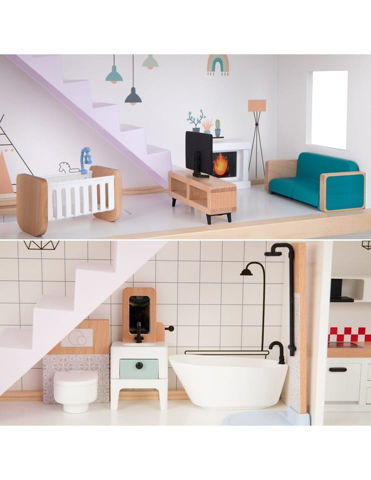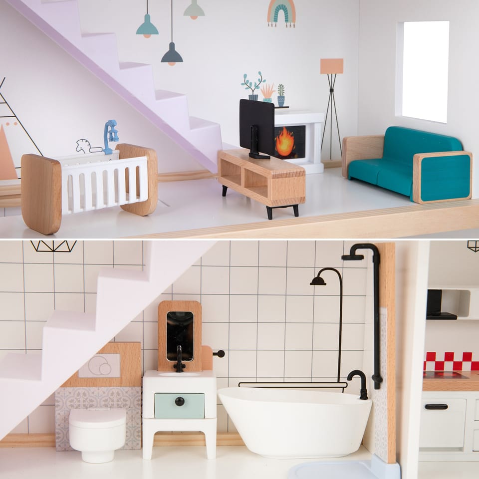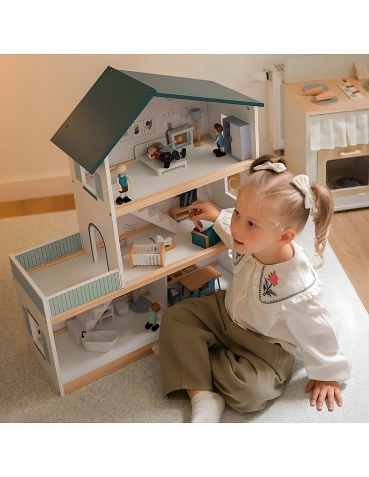 Domek dla lalek Tooky Toy wyróżnia się nowoczesnym, trzypiętrowym designem, wykonany w całości z drewna. Jego stylowe linie i współczesna estetyka sprawiają, że jest idealnym wyborem dla dzieci, które cenią nowoczesną architekturę. Domek oferuje trzy poziomy pełne atrakcji, z każdym piętrem wyposażonym w unikalne pomieszczenia i funkcje.