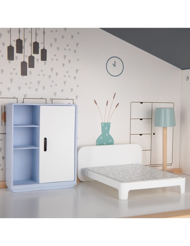 Na parterze znajduje się kuchnia z jadalnią, obok łazienka, wyposażona we wszystkie niezbędne elementy, takie jak wanna, prysznic i toaleta. Pierwsze piętro mieści przestronny salon z przytulną kanapą i telewizorem, gdzie lalki mogą odpoczywać i spędzać czas razem. Poddasze to urocza sypialnia z wygodnym łóżkiem, szafą oraz łóżeczkiem dziecięcym. Z sypialni można wyjść na balkon, który jest idealnym miejscem do relaksu i podziwiania widoków.