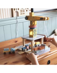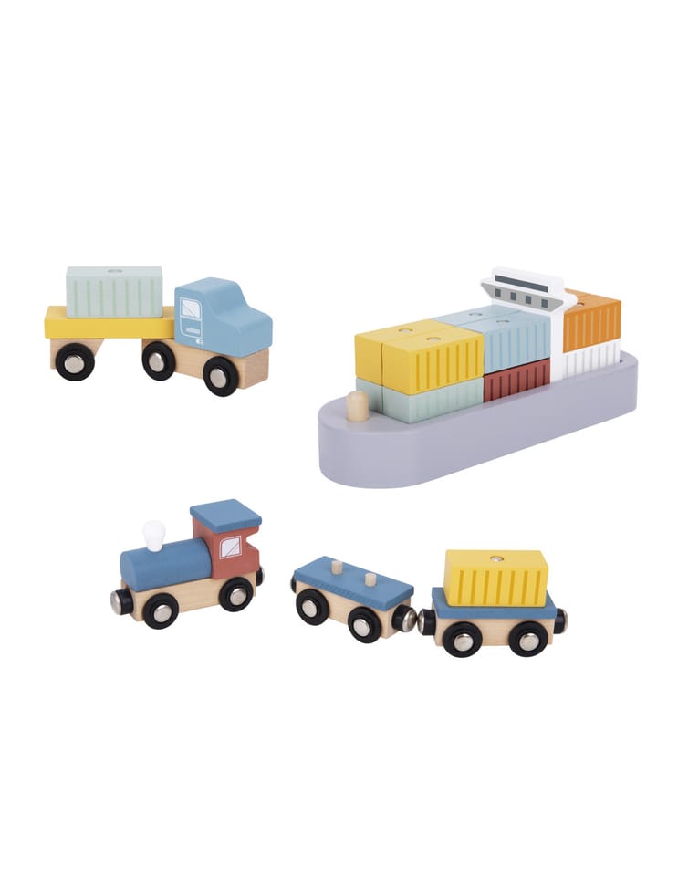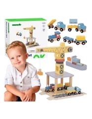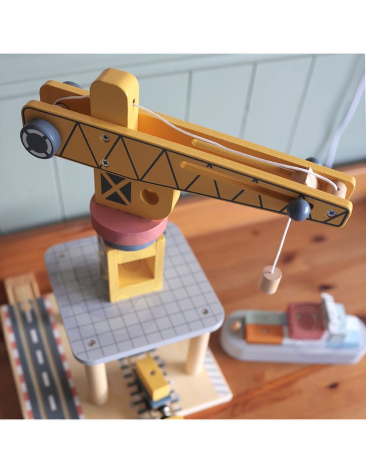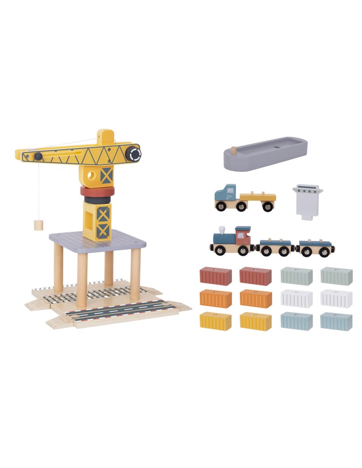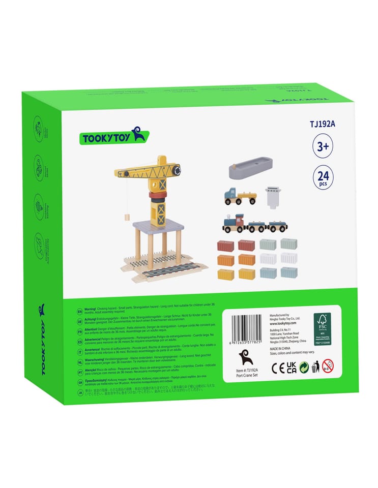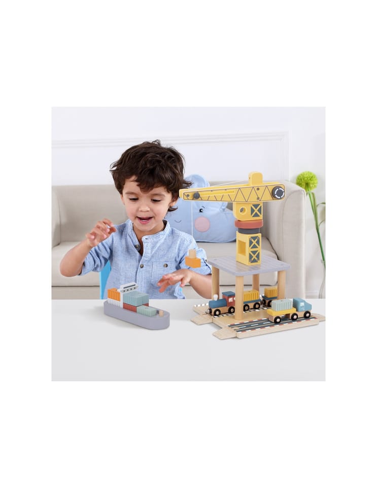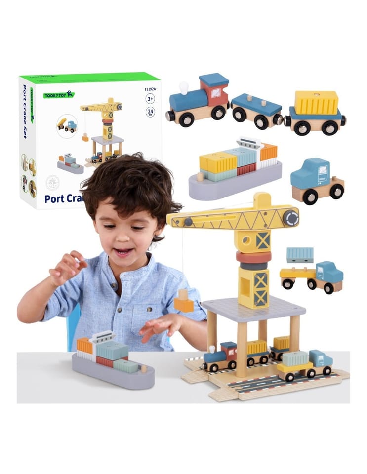 Odkryj fascynujący świat transportu i logistyki z drewnianym zestawem portowym od Tooky Toy! Ta starannie wykonana zabawka przenosi dzieci w sam środek portowego zgiełku, gdzie mogą przeładowywać kontenery za pomocą dużego obrotowego dźwigu, przewozić ładunki pociągiem, ciężarówkami i statkiem. Zestaw zachwyca kolorystyką, solidnością i dbałością o detale, zapewniając długie godziny kreatywnej zabawy, która nigdy się nie nudzi.