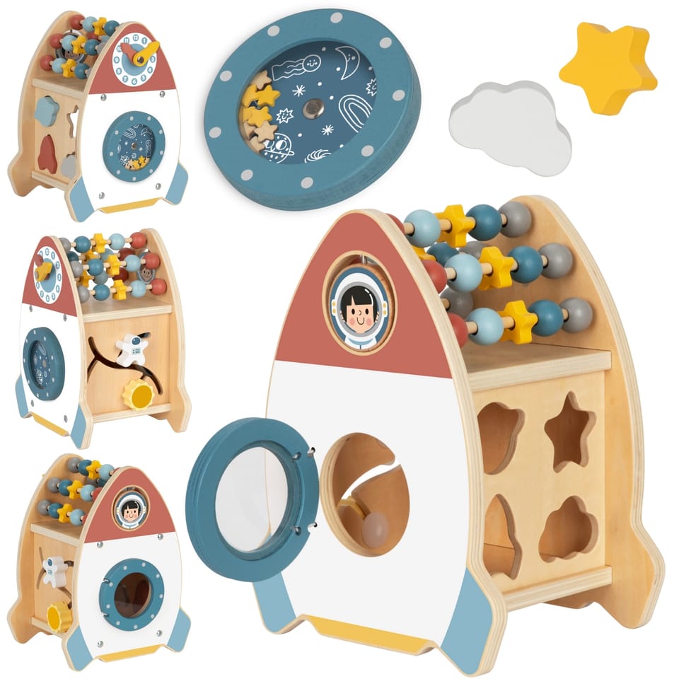 Kosmiczna Rakieta Aktywności od Tooky Toy to wyjątkowa zabawka, która zaprasza najmłodszych do odkrywania kosmicznych tajemnic poprzez angażującą zabawę. Jej uroczy kształt i delikatne kolory zostały zaprojektowane z myślą o dzieciach od 18 miesiąca życia, łącząc estetykę z bezpieczeństwem. Dzięki sześciu różnorodnym aktywnym funkcjom, takim jak przesuwanie koralików, przesuwanie po labiryncie, obracanie galaktyki czy sortowanie kształtów, dzieci mogą rozwijać swoje zdolności motoryczne, ćwiczyć koordynację oraz pobudzać wyobraźnię.