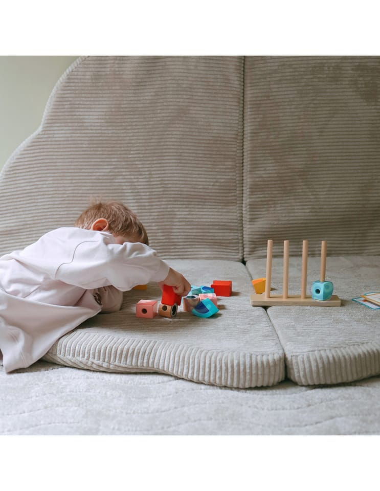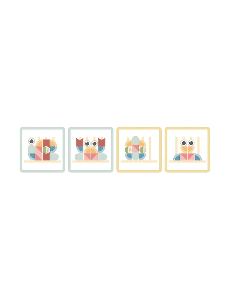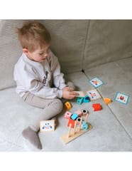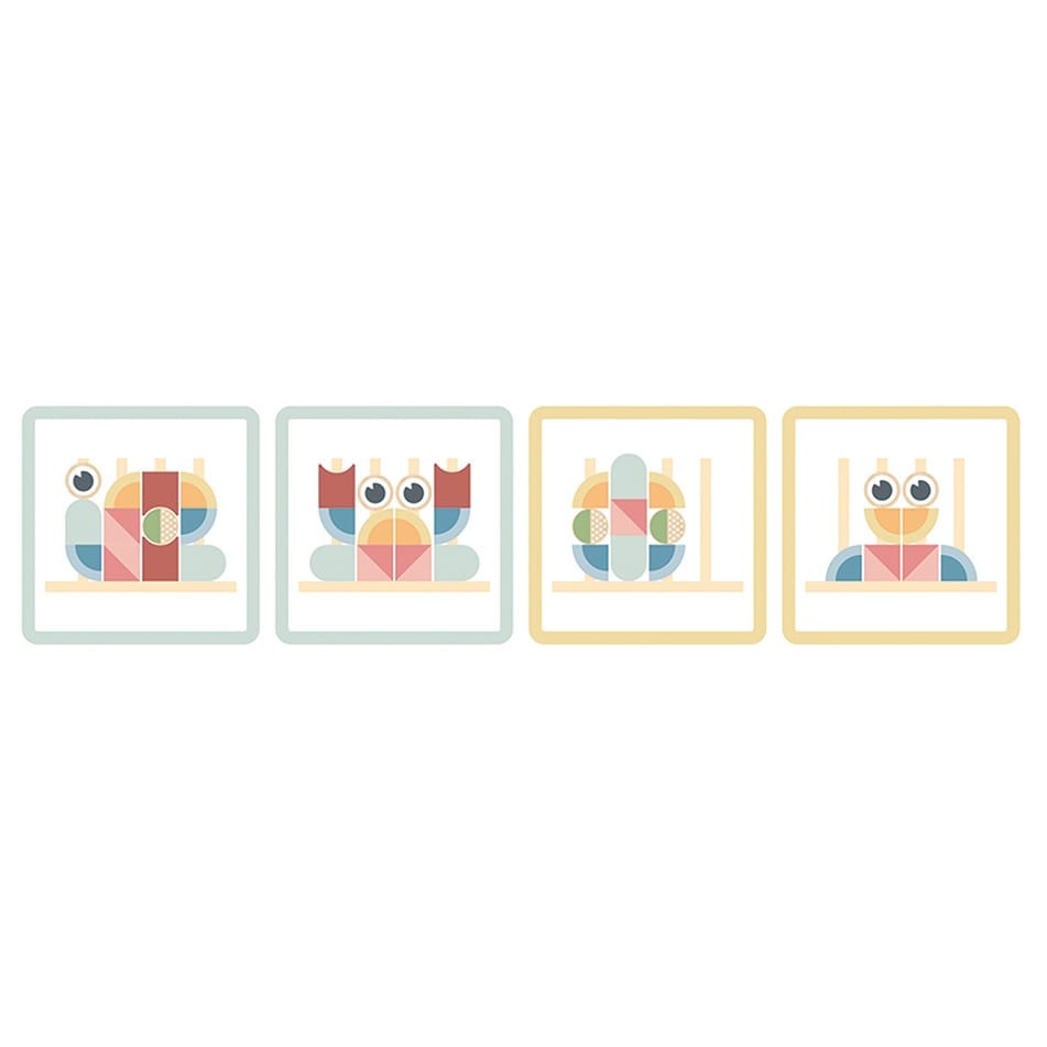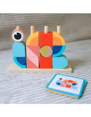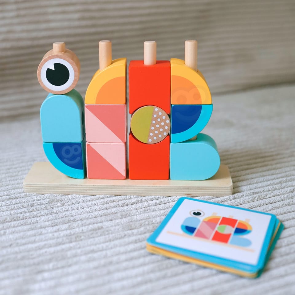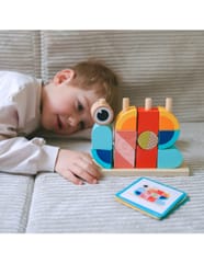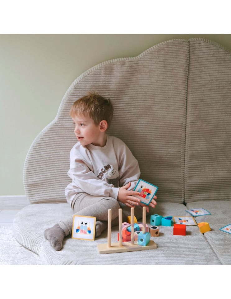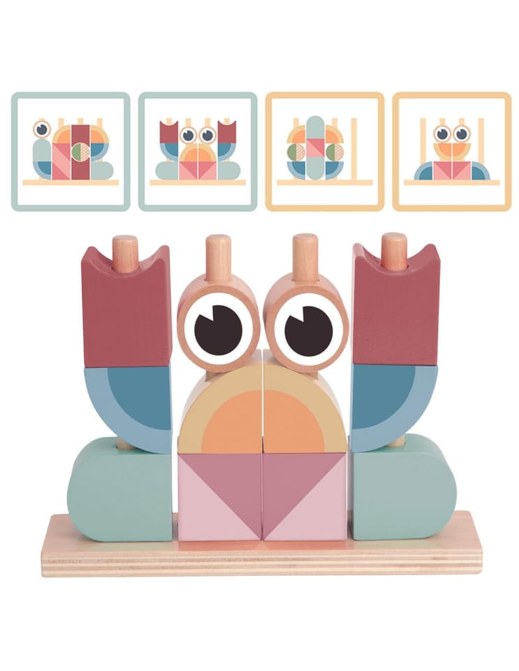 - - zestaw zawiera 18 elementów: drewnianą podstawkę do układania, 12 klocków oraz 5 dwustronnych kart z wzorami