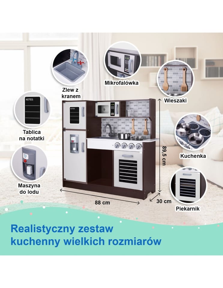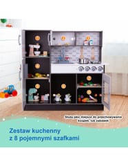 Drewniana konstrukcja kuchni gwarantuje trwałość i estetykę, a dodatkowo zapewnia realistyczne wrażenia podczas zabawy.