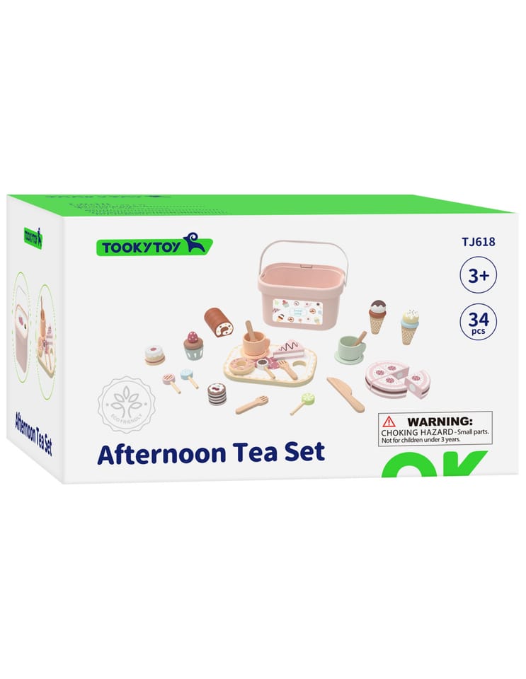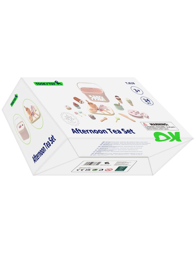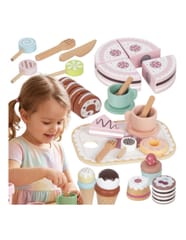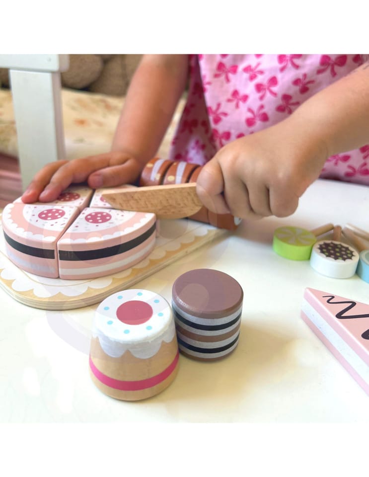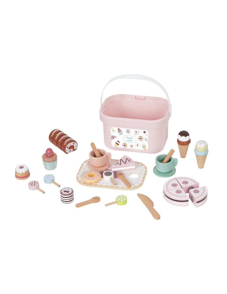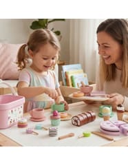 Witaj w słodkim świecie zabawy! Ten uroczy zestaw drewnianych deserów zamieni każdy dzień w prawdziwe przyjęcie herbaciane. Dzieci będą mogły kroić urocze drewniane torty, nakładać babeczki, ciasteczka i lody na drewnianą podstawkę, a także przenosić całą ucztę w estetycznym pudełku ze słodką grafiką. Drewniane akcesoria podzielone na części łączące się na rzepy sprawiają, że zabawy może być bez końca - a każda wizyta w słodkiej kawiarni to nowa przygoda rozwijająca wyobraźnię.