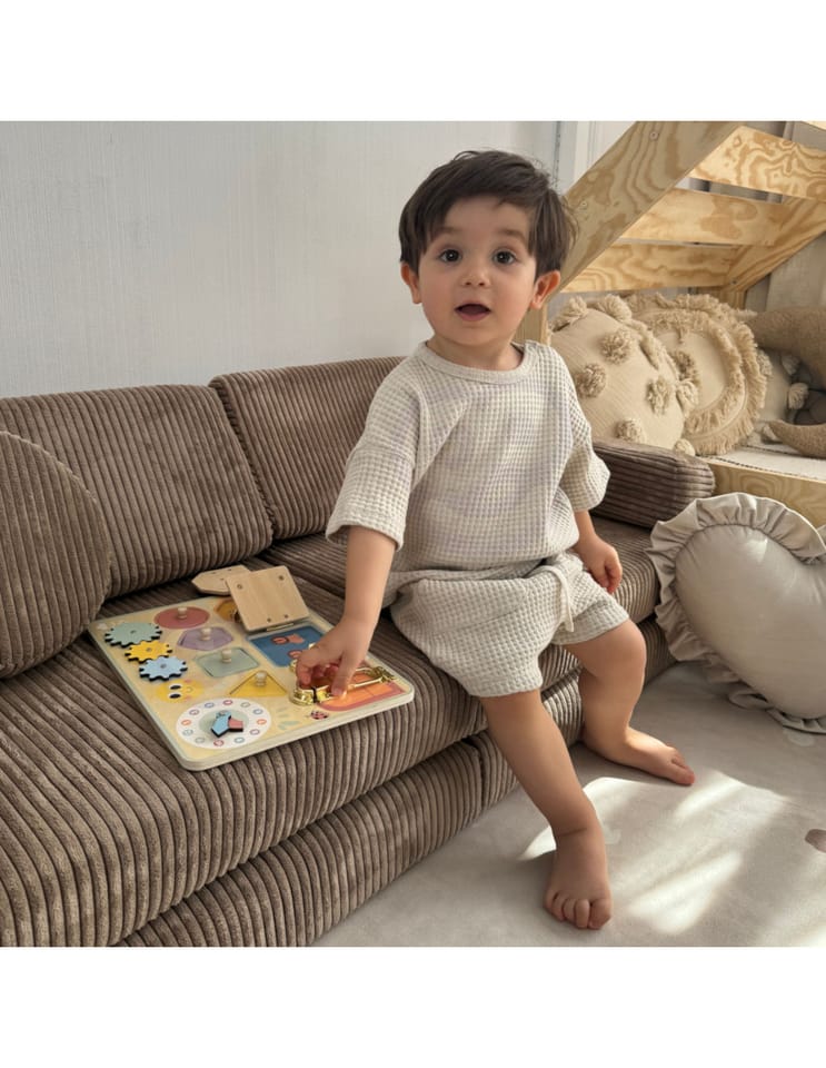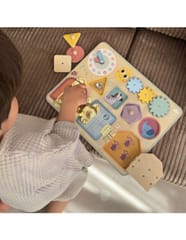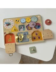 - - Różnorodne aktywności na jednej planszy: zamki, okienka, koła zębate, sorter kształtów i zegar