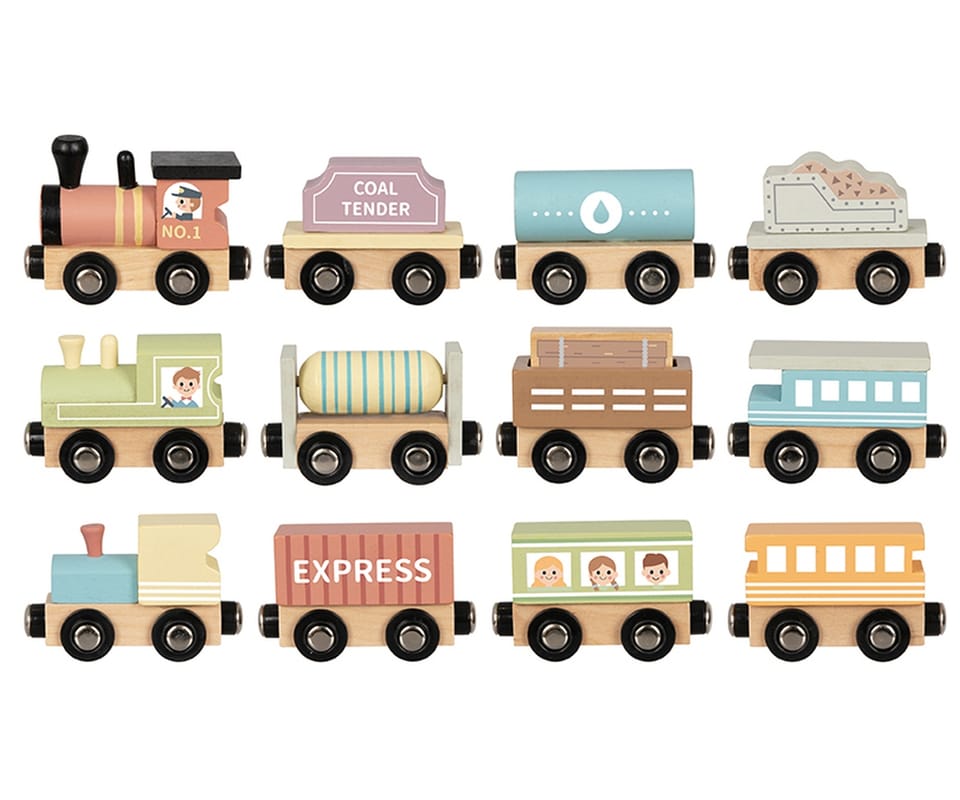 Zestaw drewnianych wagoników i lokomotyw od Tooky Toy to idealna zabawka dla małych miłośników pociągów. Komplet składa się z 13 kolorowych elementów, które można dowolnie łączyć dzięki wbudowanym magnesom. Całość zamknięta jest w estetycznym, drewnianym pudełku z półkami, które służy jednocześnie jako organizer i wystawka dla małej kolekcji.Kolejki można używać w różnych kombinacjach tworząc własne trasy i historie podróży. Ćwiczyć sortowanie kolorami, typem wagonów i kolejnością. Produkt wykonany z drewna z certyfikatem FSC®. Malowany bezpiecznymi farbami na bazie wody i gładko wykończony, bez ostrych krawędziZalety rozwojowe: