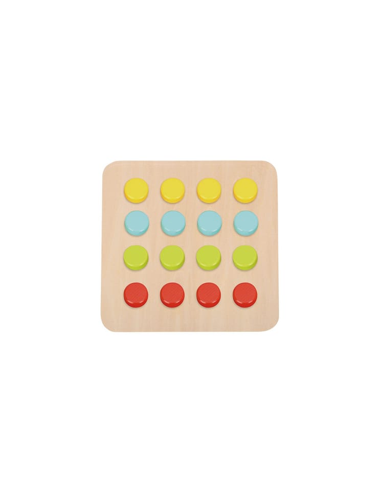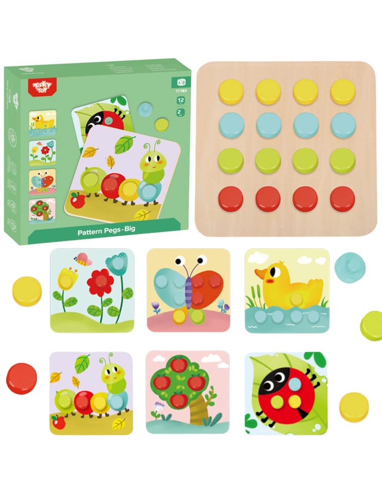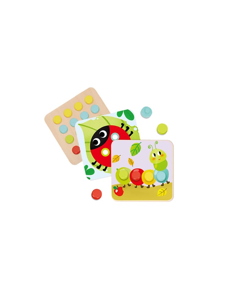 Drewniane Kolorowe Klocki od Tooky Toy dla dzieci od 12 miesiąca życia to idealne rozwiązanie do domu, jak i do przedszkola. Składa się z planszy na której jest 16 kolorowych klocuszków, oraz 6 plansz ze zwierzątkami. Do każdej planszy trzeba odpowiednio dopasować element tak, by powstał cały obrazek. Na drewnianej podstawce znajdują się wgłębienia, które swoim kształtem odpowiadają kolorowym puzzlom. Dzięki zabawce dziecko rozwija koordynację wzrokowo-ruchową.