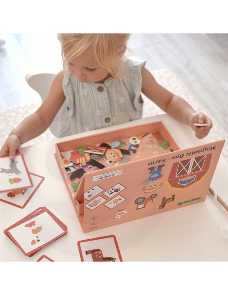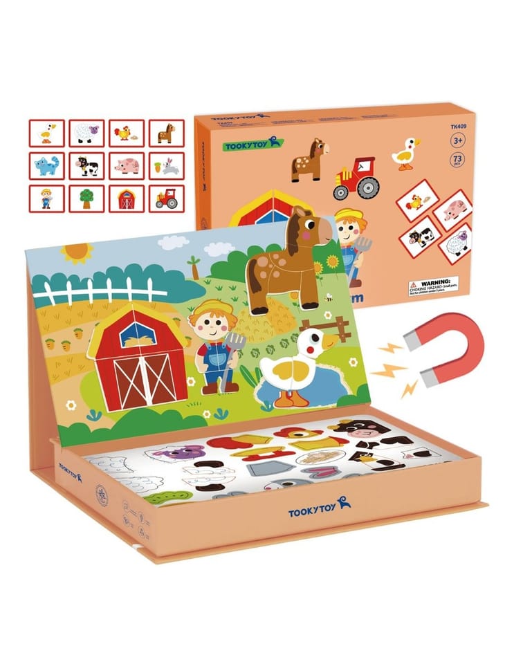 Magnetyczna Układanka Farma Puzzle marki Tooky Toy przenosi dzieci w świat wesołego gospodarstwa. Bogata grafika, mnóstwo magnetycznych elementów i możliwość tworzenia własnych scenek lub układać elementy zgodnie z dołączonymi 12 planszami. Magnetyczne puzzle gwarantują świetną zabawę i naukę przez kreatywność. Zabawa z układanką pomaga maluchom rozwijać motorykę, wyobraźnię i zdolności narracyjne. Dzięki praktycznemu zamykanemu pudełku zestaw sprawdzi się zarówno w domu, jak i w podróży.