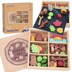 Odkryj magiczny las w domowym zaciszu! Zestaw Leśny marki Tooky Toy to starannie wykonany, drewniany zestaw otwartej zabawy, w którym dzieci budują własną leśną krainę: drzewa, listki, grzybki, zwierzątka, tęczę, fale i kamienie. Ciepłe kolory, gładkie, przyjemne w dotyku elementy oraz stonowane kolory zachęcają do twórczej zabawy. Całość mieści się w solidnej, drewnianej skrzyneczce z 6 przegrodami i pokrywką, której odwrotna strona została wykonana w formie tablicy kredowej.