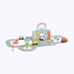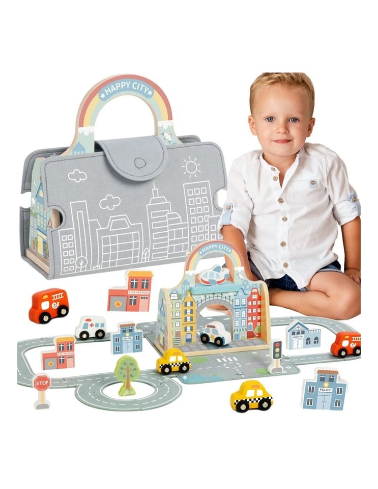 Wyobraź sobie kompletne, bajkowe miasto zamknięte w eleganckiej, filcowej torbie – gotowe do rozłożenia w każdym miejscu! Mini miasto marki Tooky Toy to nie tylko zabawka, to cały uniwersum przygód, które Twoje dziecko może stworzyć w domu, czy na wakacjach. Kolorowy zestaw z tęczową bramą, drewnianymi budynkami, pojazdami ratunkowymi i elastycznymi elementami drogi zaprasza do nieskończonych możliwości zabawy. Każdy element został zaprojektowany z dbałością o szczegóły – od wesołej karetki, przez sygnalizację świetlną, aż po urocze drzewko. To miasto, które nigdy nie śpi i zawsze czeka na nowe historie!