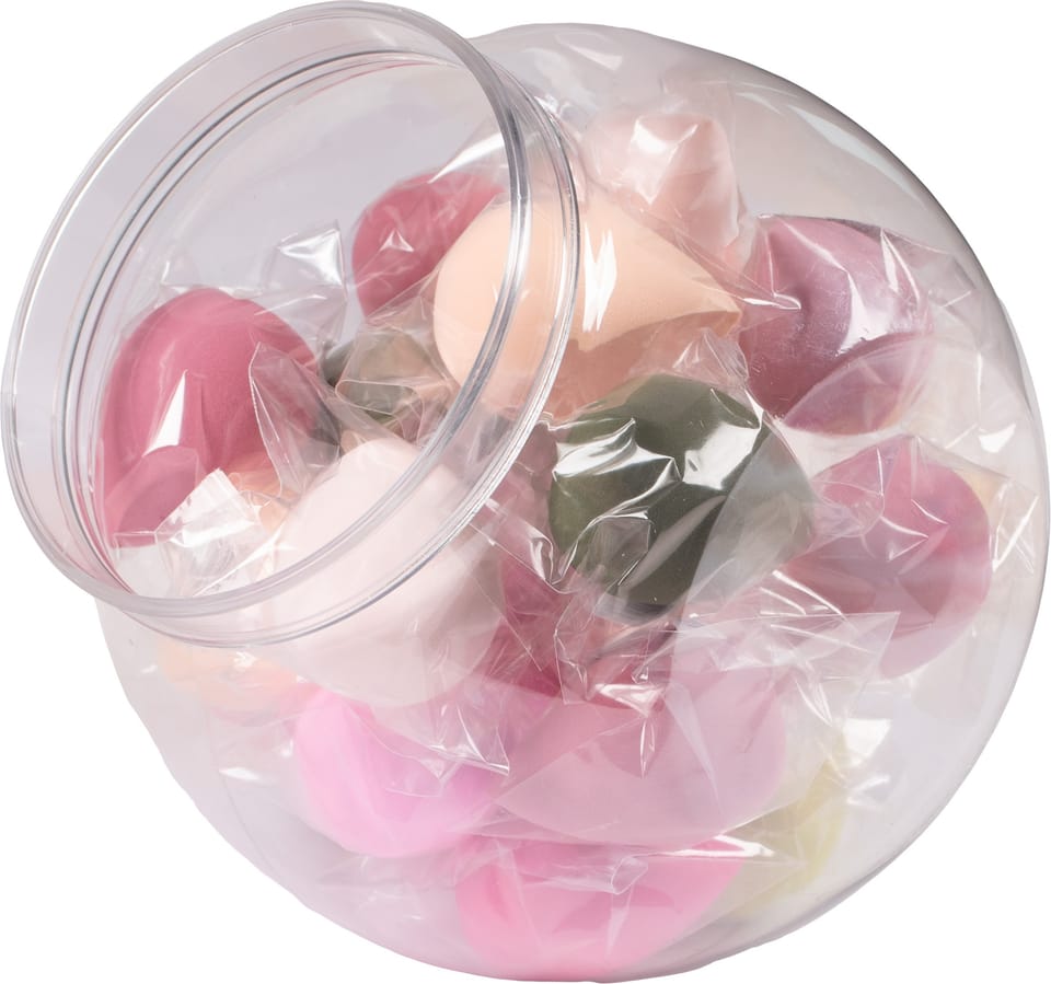 W pojemniku znajdują się 24 gąbki o różnych kolorach.