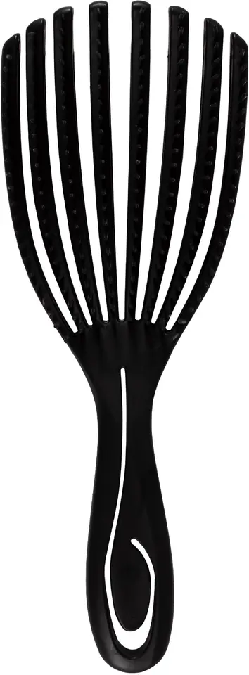 Szczotka do rozczesywania włosów kręconych i podatnych na plątanie. Wyposażona w osiem rzędów delikatnych dla włosów igieł. Wentylowany korpus. Ergonomiczny, wygięty kształt, wygodna rączka.